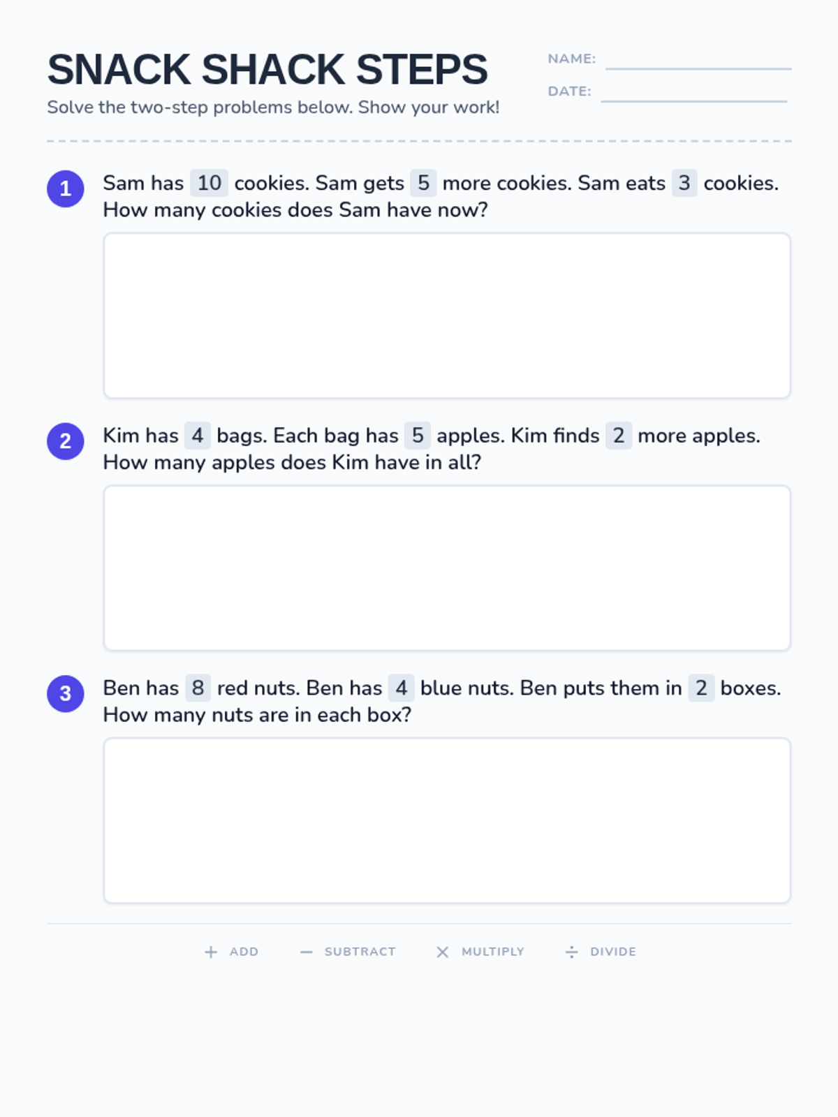 A revised low-lexile worksheet featuring three two-step word problems involving mixed operations, adjusted to fit on a single page with clear workspace boxes.