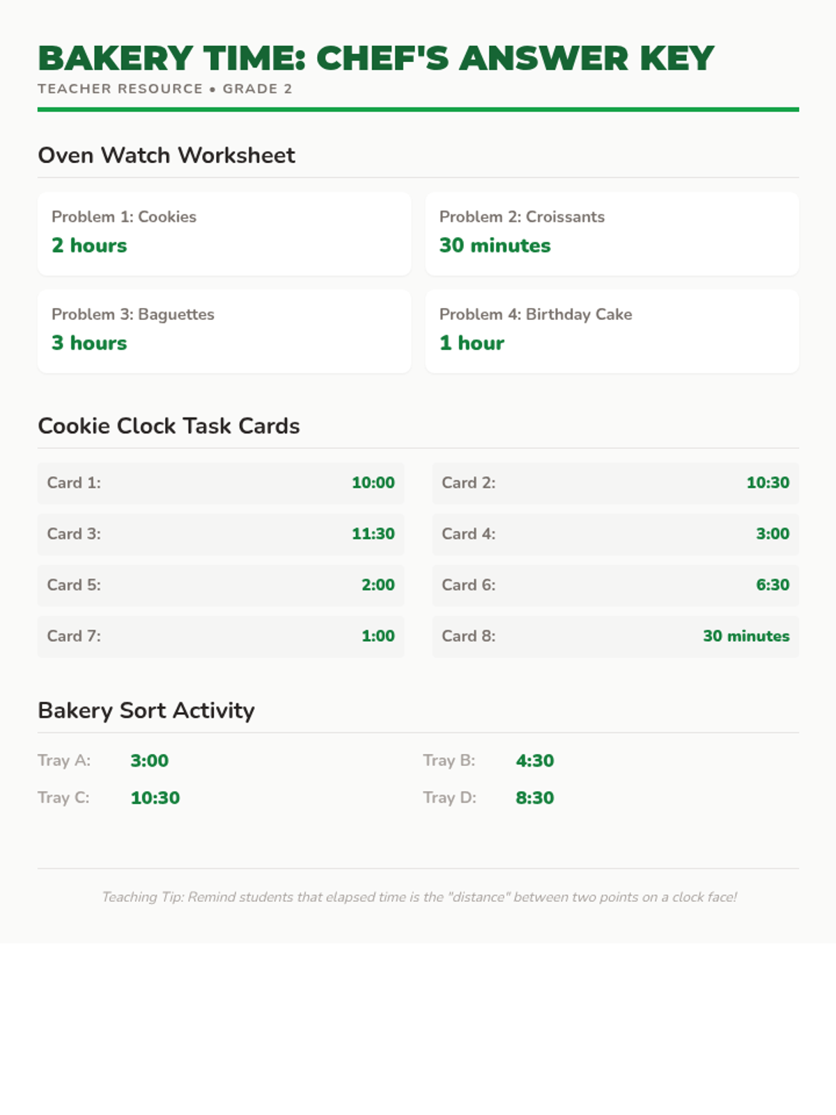 A comprehensive teacher's answer key for all "Bakery Time" activities. streamlined to fit on a single page.