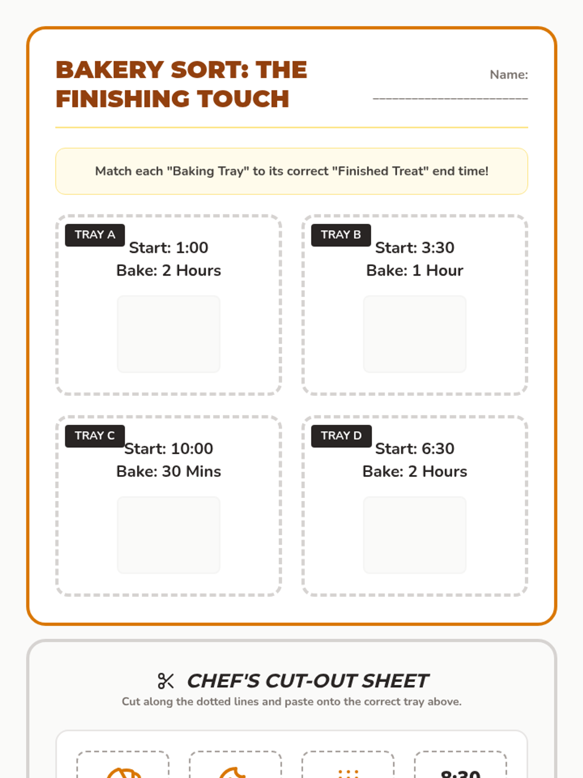 A cut-and-paste activity where students calculate the end time for baking trays and match them with the correct finished treat labels. Fixed page breaks and missing icons.