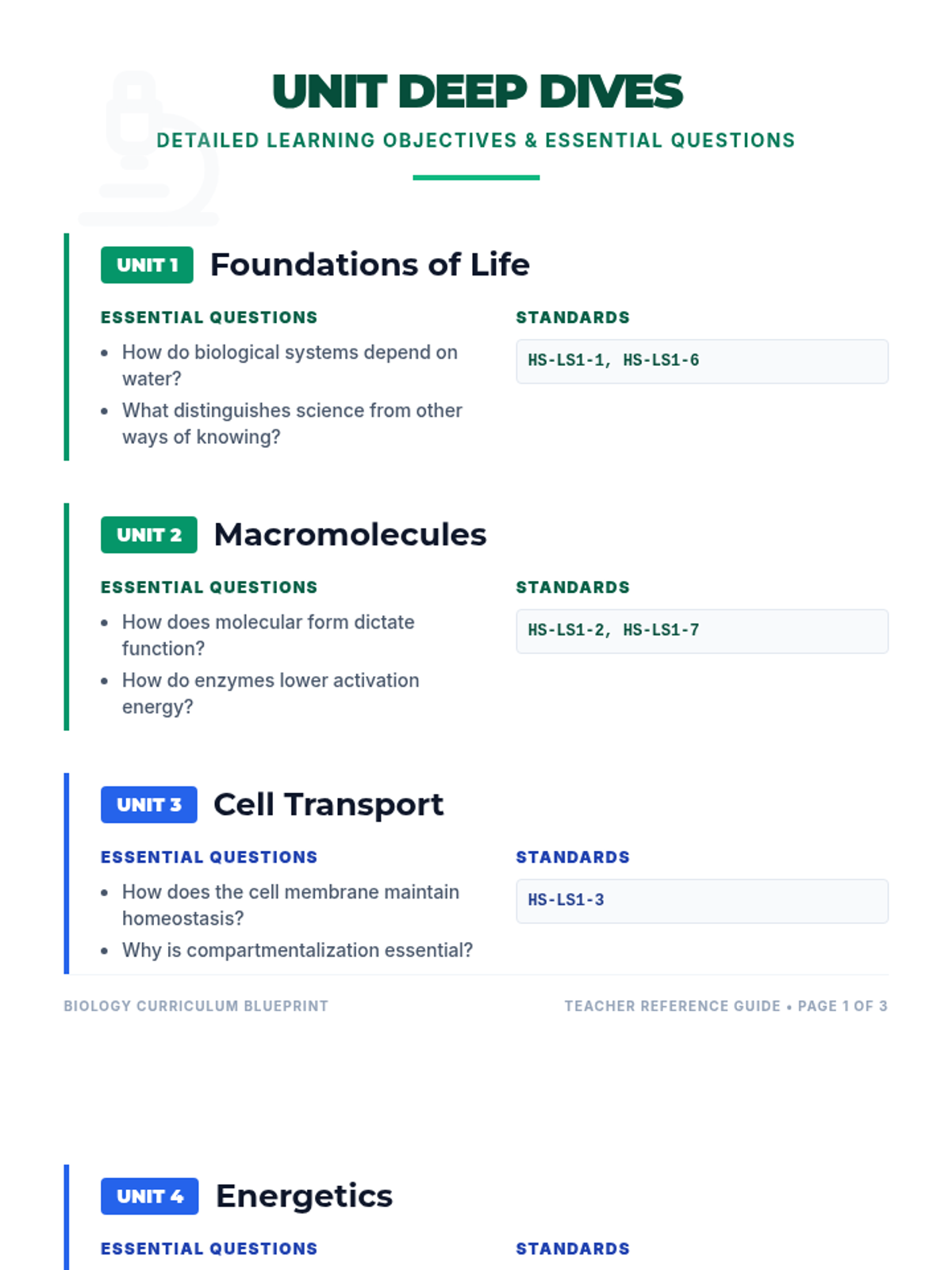 A complete unit-by-unit breakdown for a full-year Biology curriculum (Units 1-10), including essential questions and standard alignments. Revised for completeness and formatting.