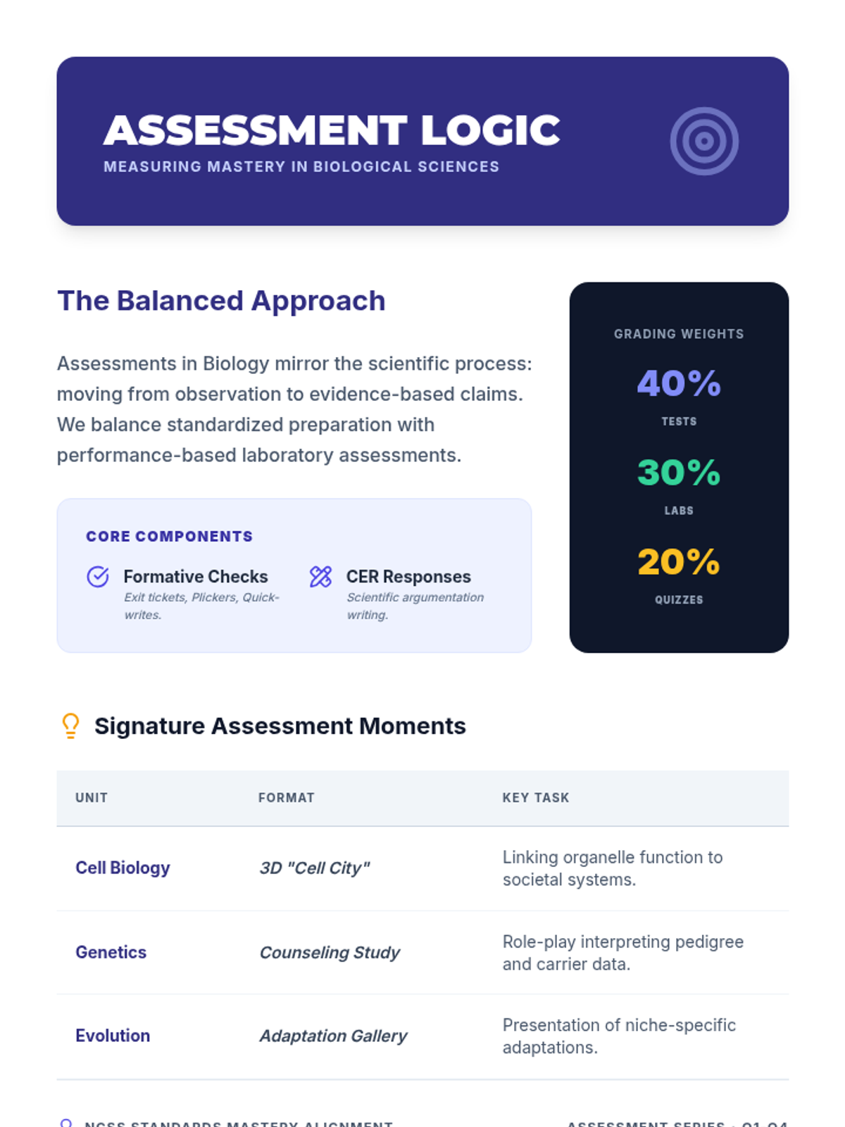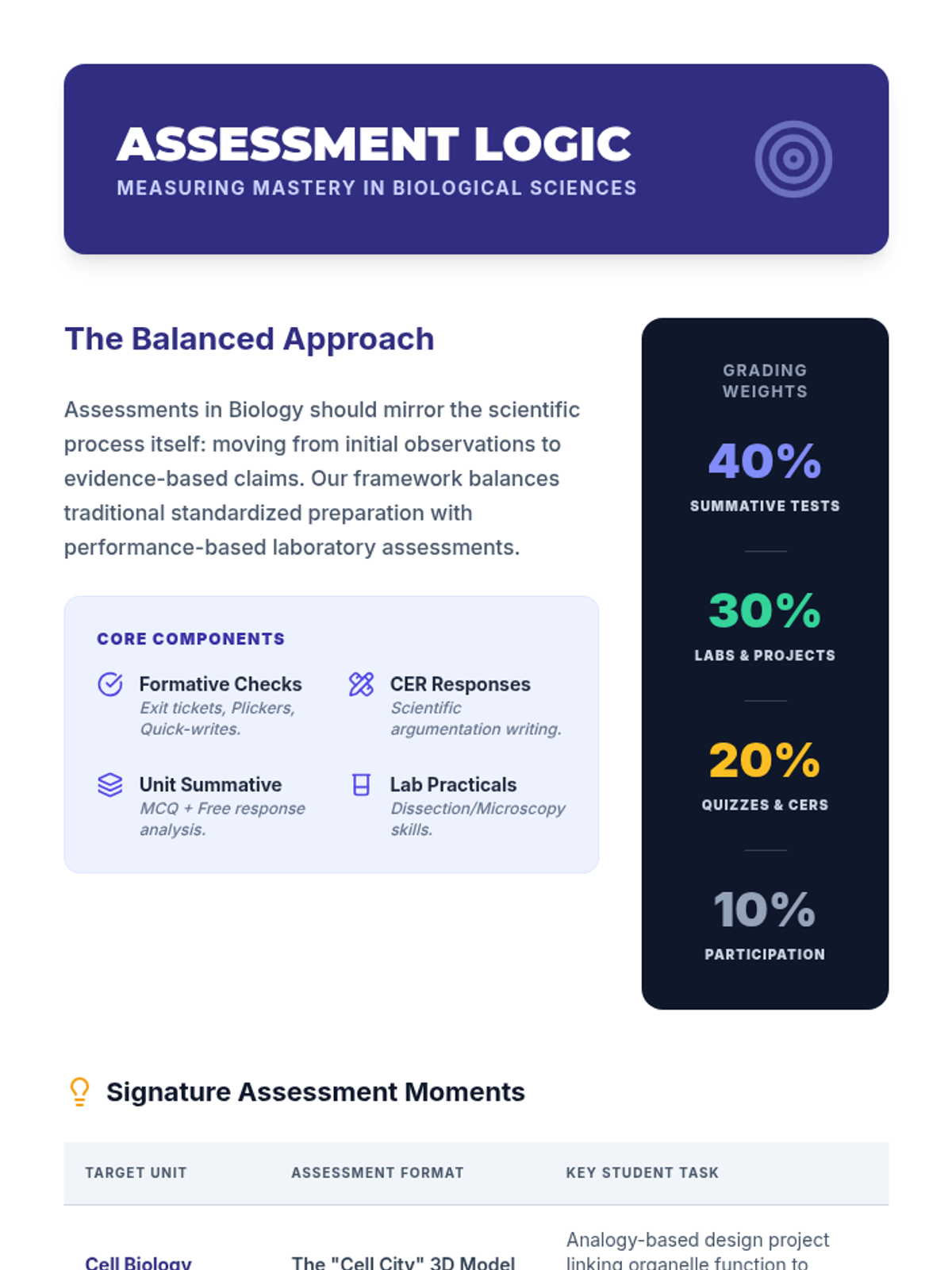 A strategic guide for teachers on grading weights and assessment formats for high school Biology. Revised to fit on a single page and improve legibility.