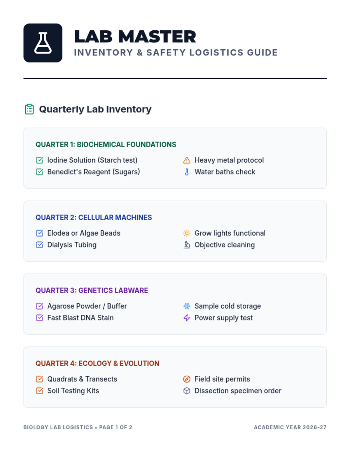 A full-year planning resource for teachers to manage lab equipment, chemical inventory, and safety compliance. Revised to include Quarter 4 and improved formatting.