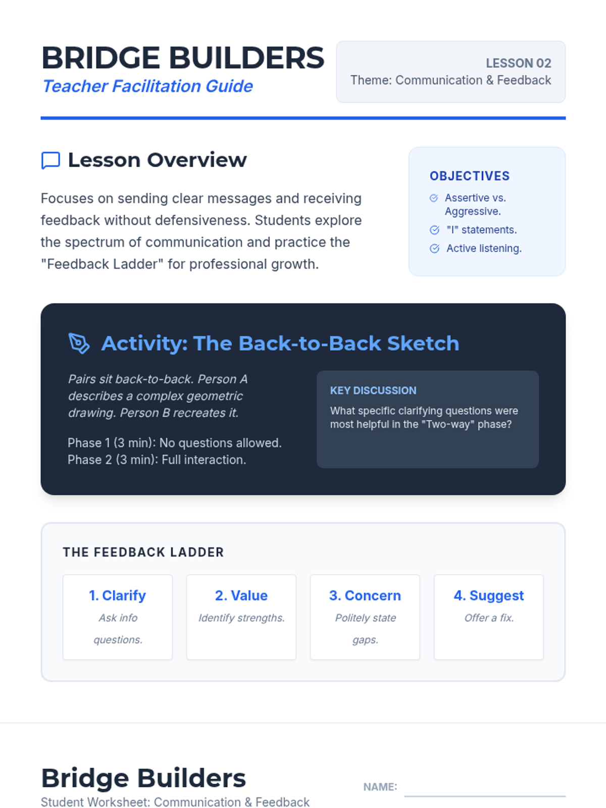 A teacher facilitation guide and student worksheet for Lesson 2, emphasizing assertive communication and the professional feedback cycle. Revised to fix layout breaks and enlarge student work areas.