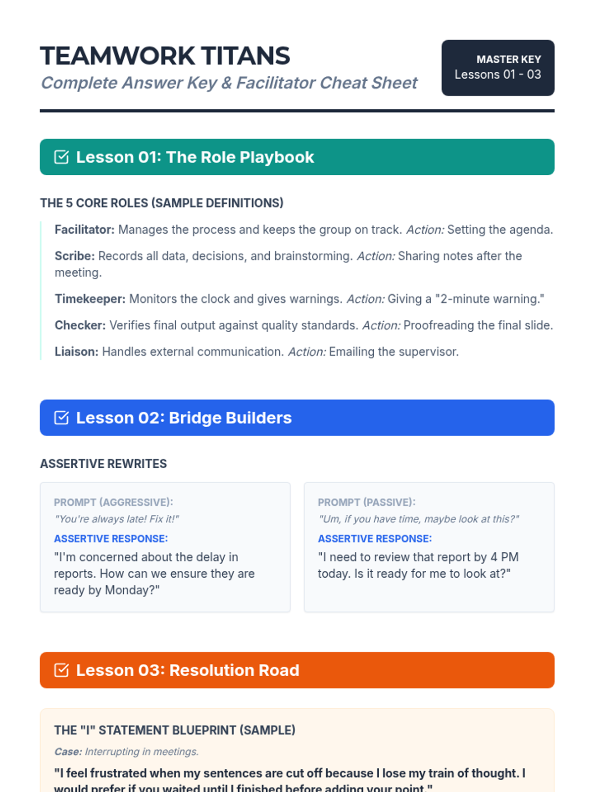 A comprehensive teacher answer key and facilitator cheat sheet for all three lessons in the Teamwork Titans sequence. Revised to fix logical errors and orphaned headers.