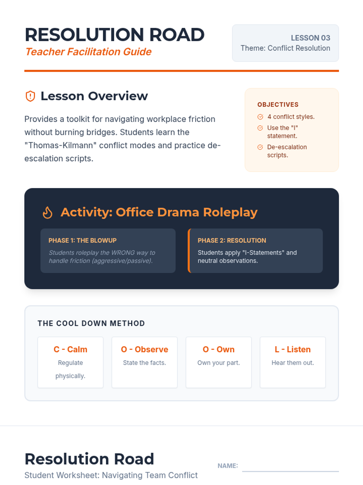 A teacher facilitation guide and student worksheet for Lesson 3, focusing on "I" statements, conflict styles, and professional de-escalation. Revised to fix page breaks and matching mechanics.