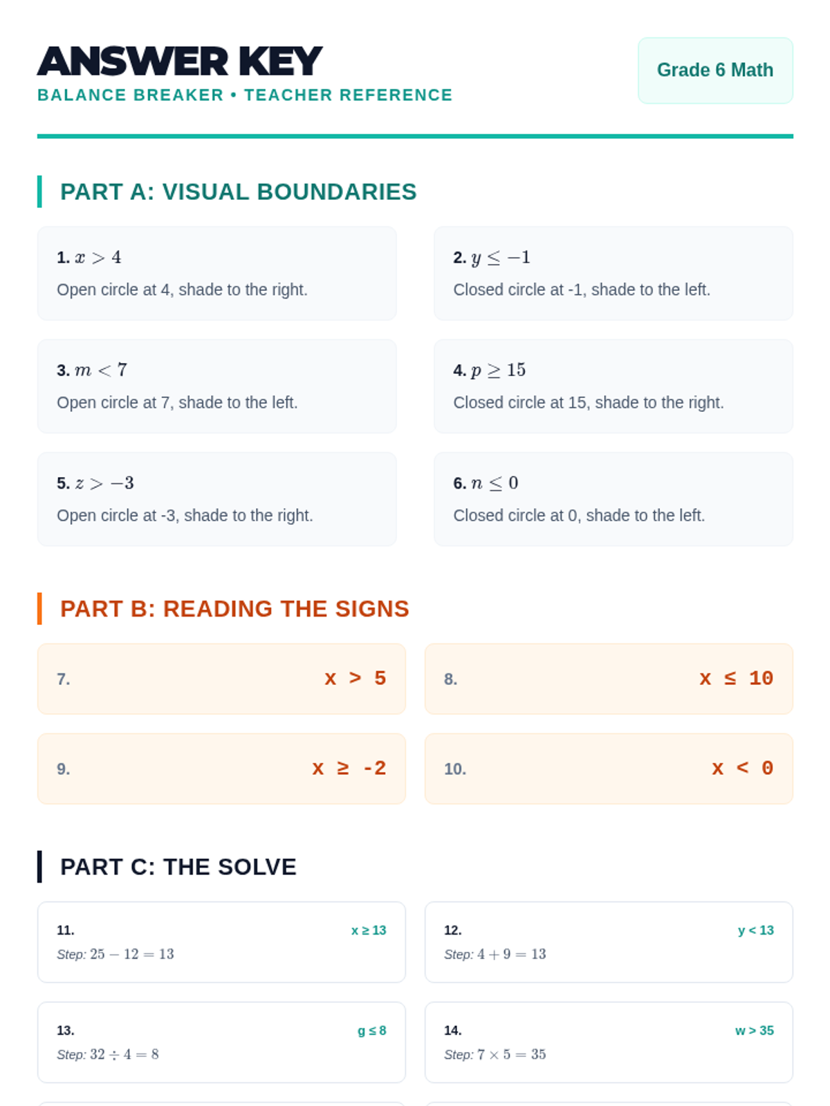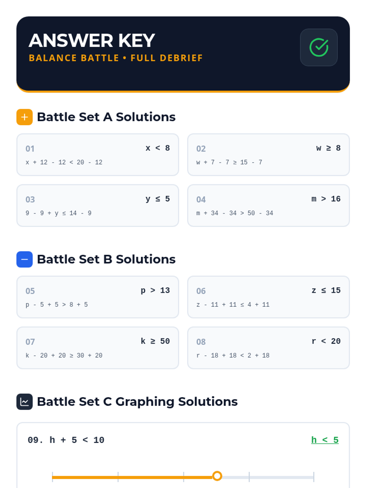 A comprehensive answer key for the Balance Battle worksheet, featuring step-by-step solutions and correctly graphed number lines for teacher reference.