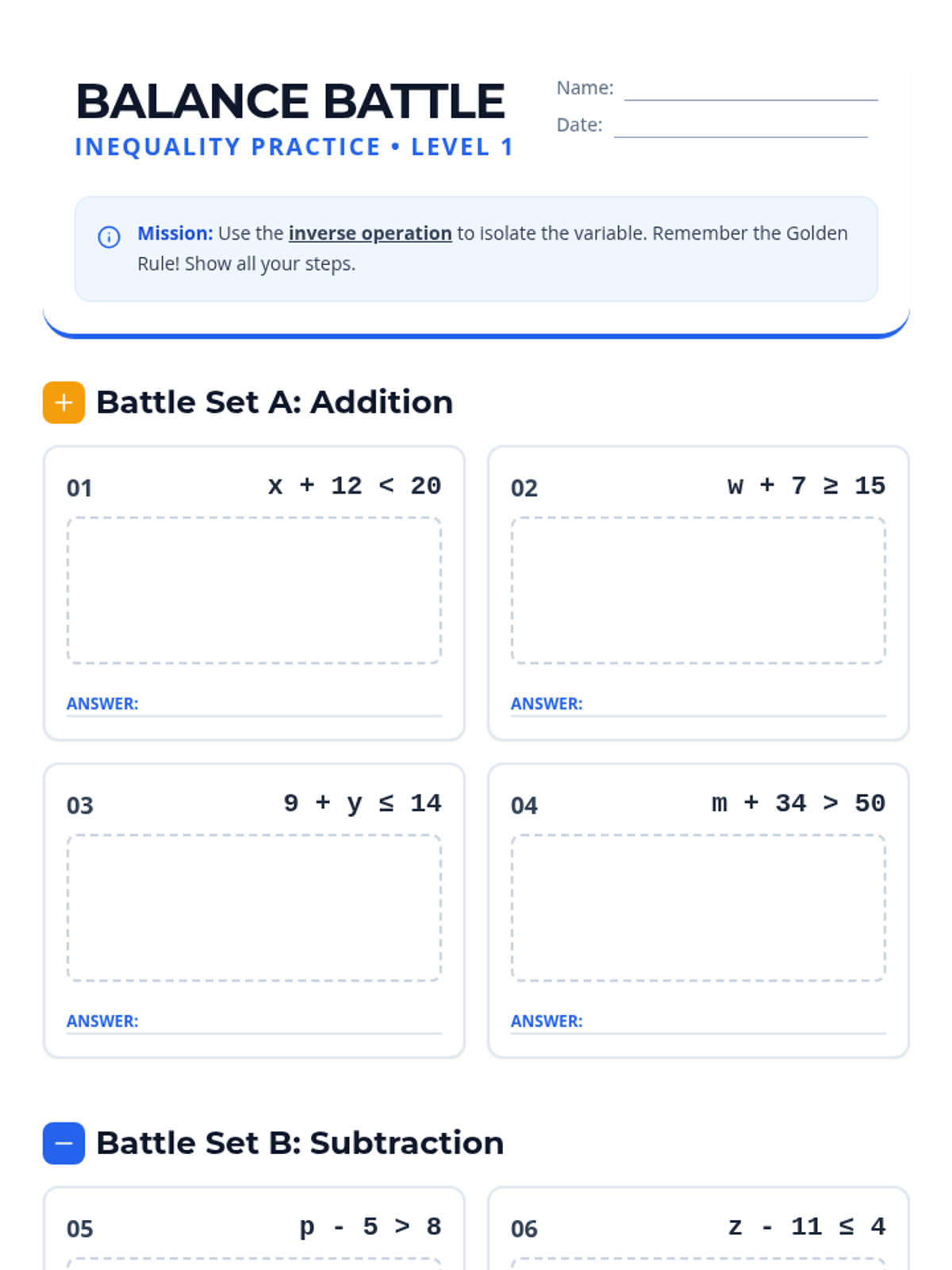 A structured practice worksheet for one-step inequalities involving addition and subtraction. Includes clear work areas for solving and number lines for graphing solutions.
