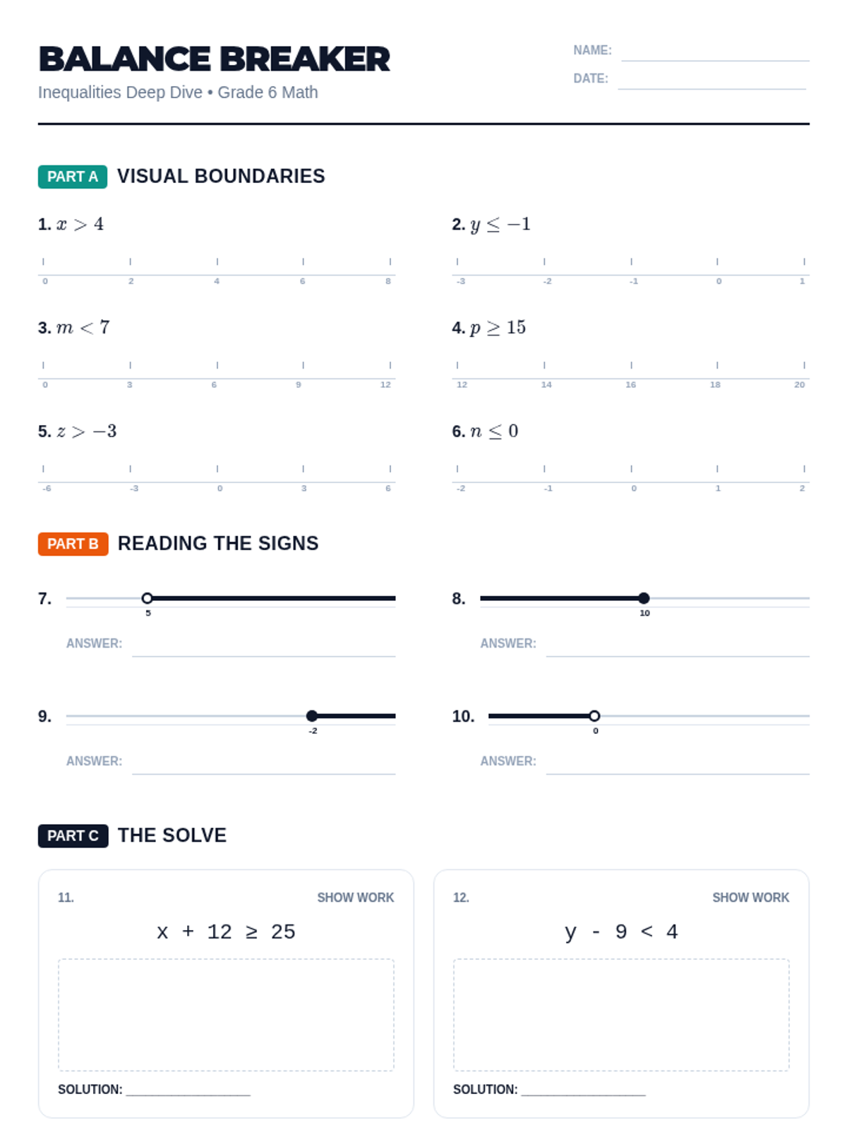 A 20-question, two-page deep-dive worksheet covering graphing, reading graphs, solving one-step inequalities, and real-world word problems. Revised for better page breaks, legibility, and completeness.