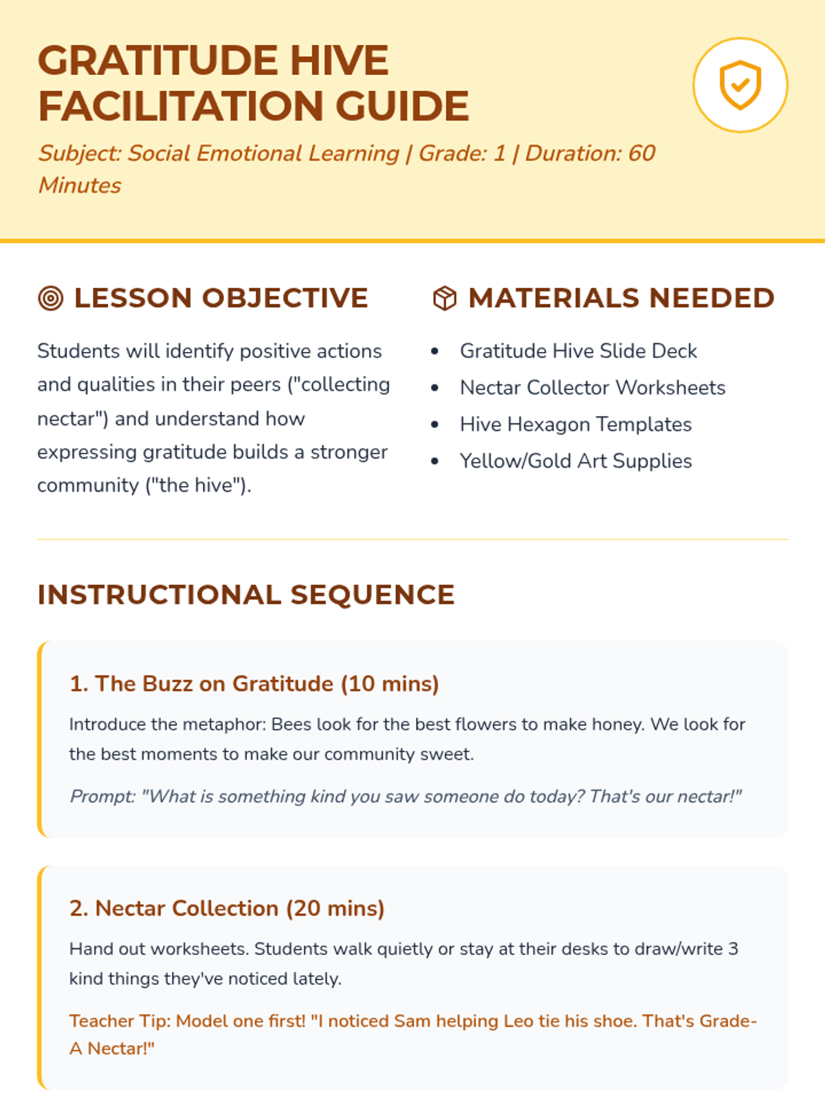 A comprehensive teacher's guide for 'The Gratitude Hive' lesson, outlining the instructional sequence, objectives, and differentiation strategies for first-grade students.