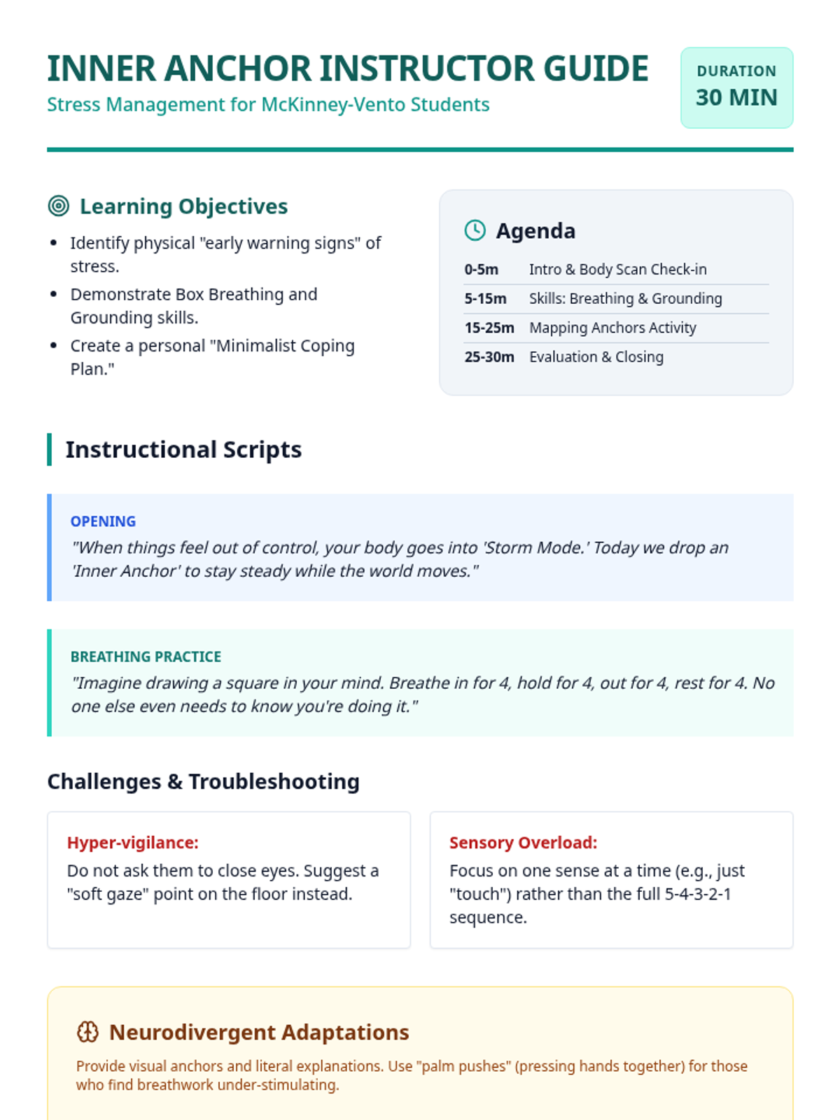 A comprehensive instructor manual for a 30-minute stress management session, including scripts, neurodivergent adaptations, and a fidelity checklist.