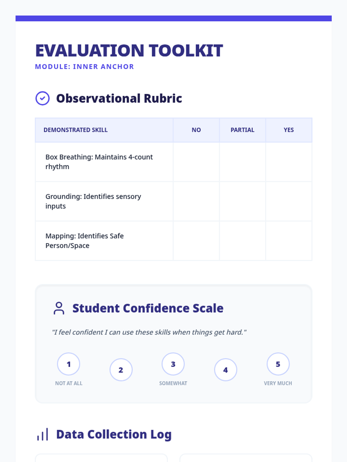 Outcome measures and evaluation toolkit for the Inner Anchor session, including observational rubrics, student confidence scales, and program metrics logs.