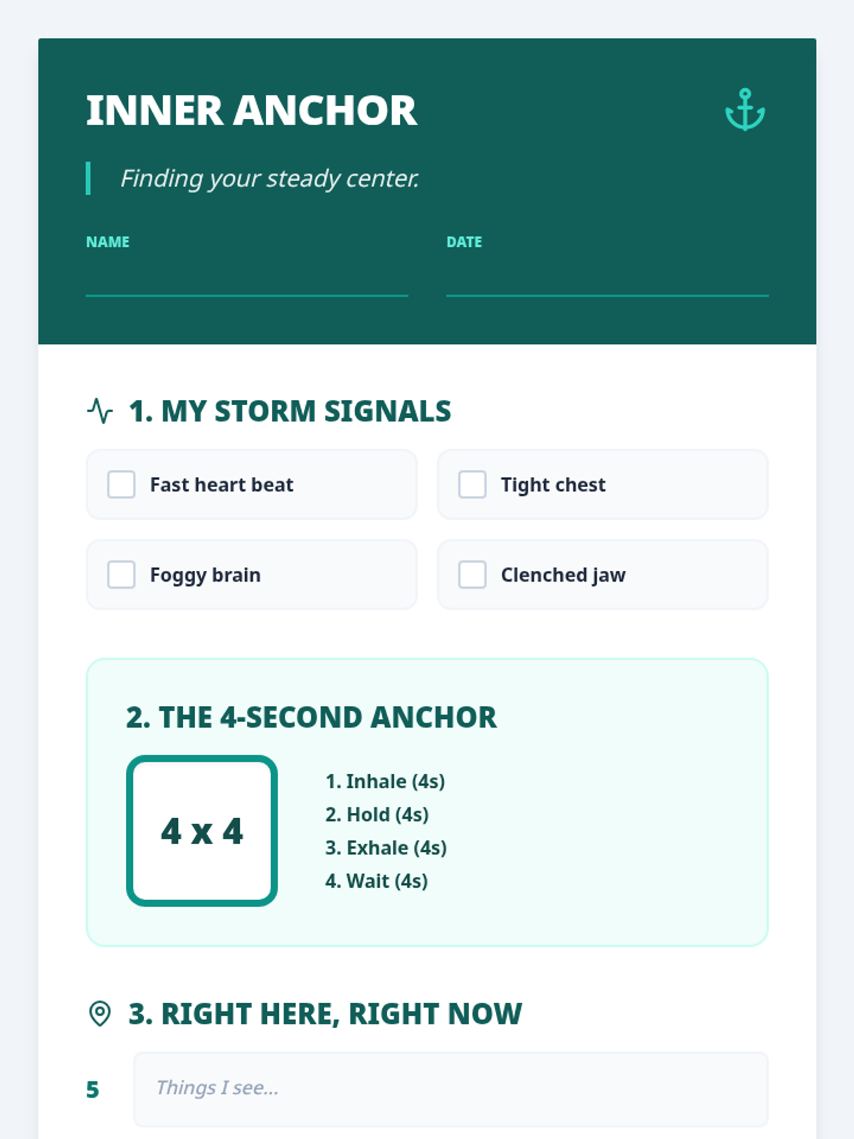 Visual slide deck for the Inner Anchor stress management session, featuring clear, high-contrast instructional visuals for breathing and grounding techniques.