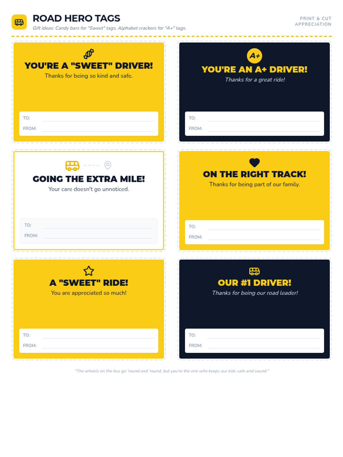 A set of colorful, themed gratitude tags designed for bus drivers. The printable sheet includes specific pun-based tags for candy bars and alphabet crackers, as well as general appreciation messages, featuring a bright yellow bus aesthetic with easy-to-cut dashed lines and name fields.