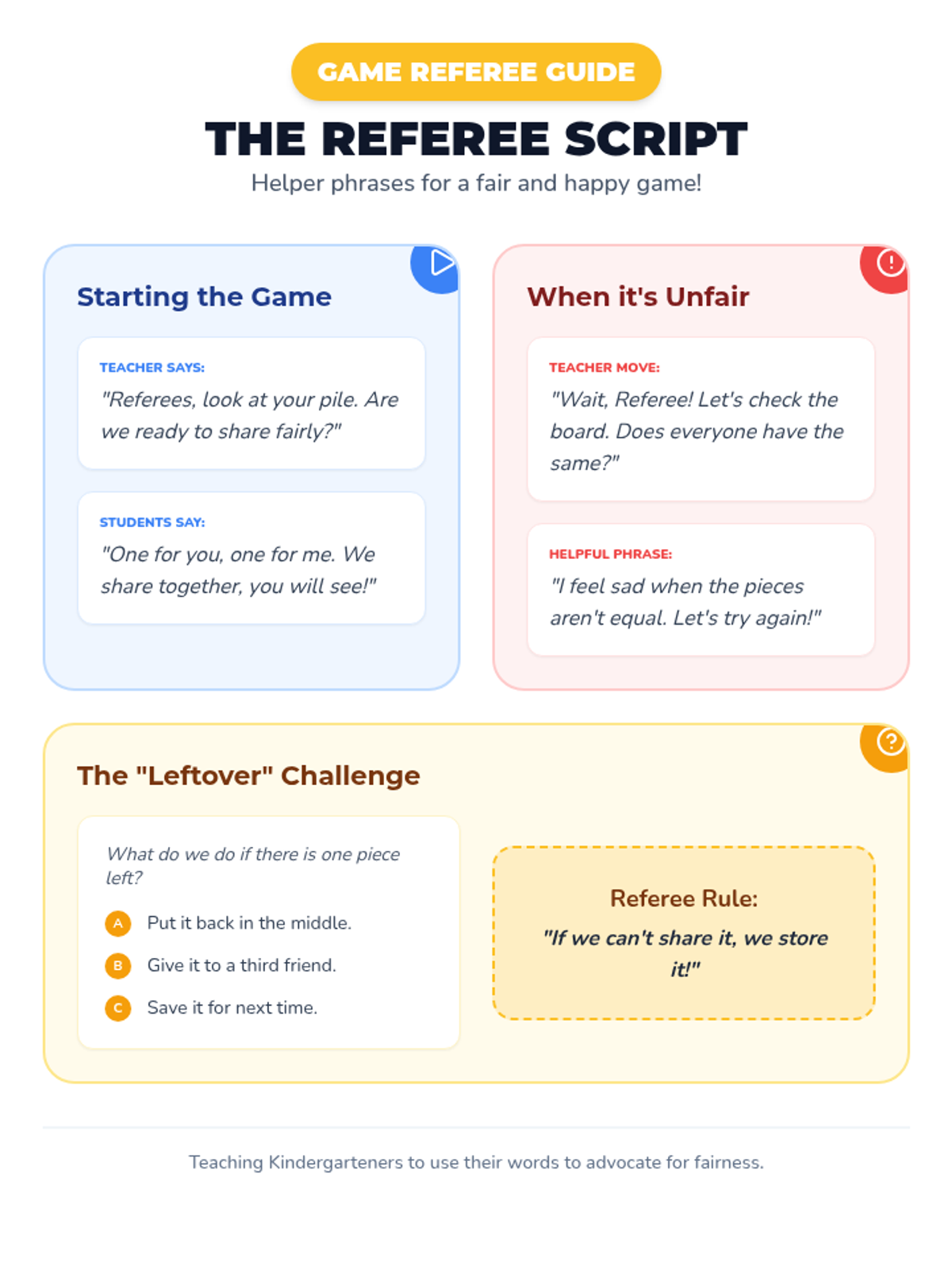 A teacher and student prompt guide containing scripted phrases and conflict-resolution strategies for the 'Fair Share' game play. It focuses on using 'Fair Talk' and solving the challenge of leftover pieces.