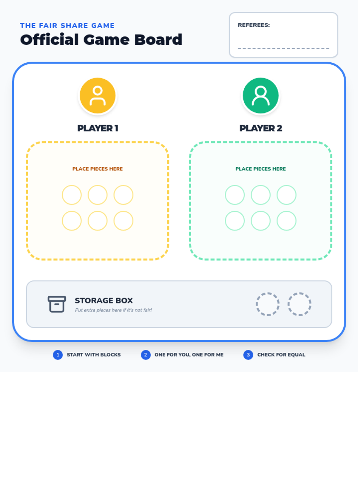 A printable game board for Kindergarten pairs to practice fair distribution of manipulatives. It features two designated player zones and a 'Storage Box' for odd-numbered leftover pieces.