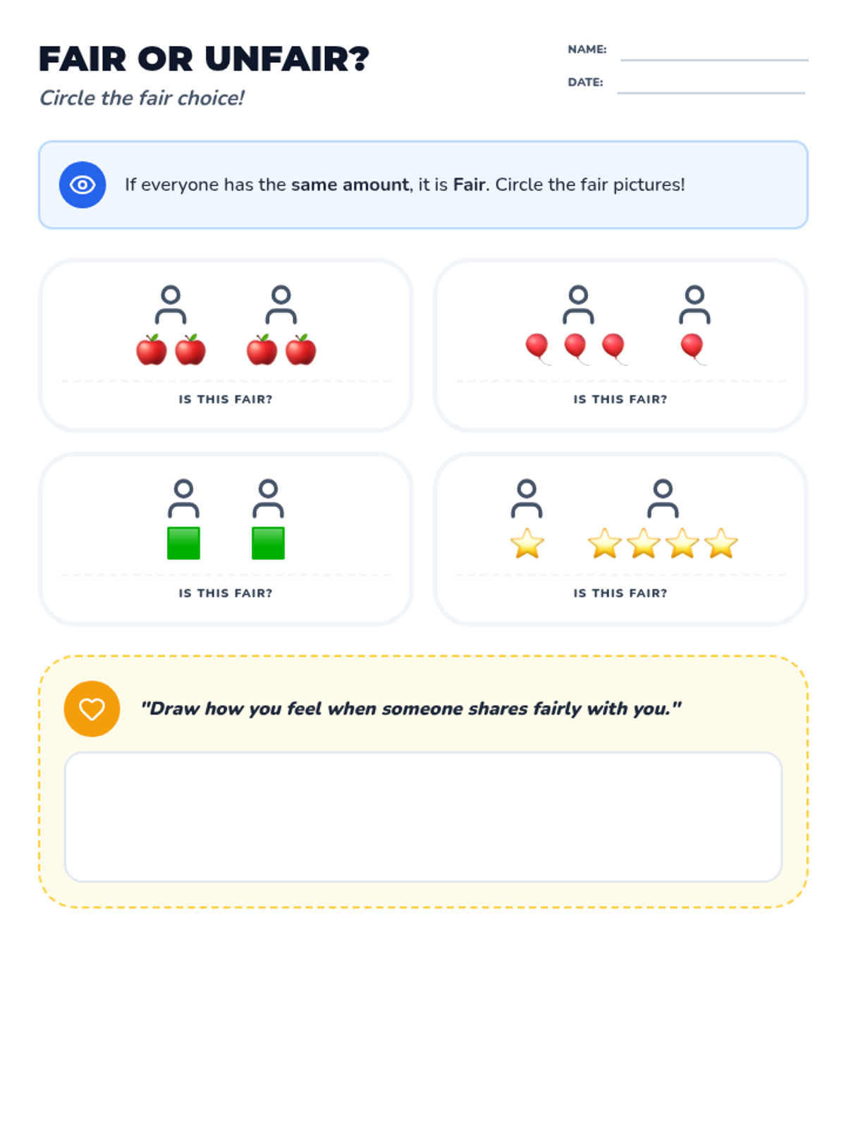 A visual assessment worksheet for Kindergarten students to identify fair versus unfair distribution scenarios. Students circle scenarios where items are shared equally and draw a reflection on their feelings.