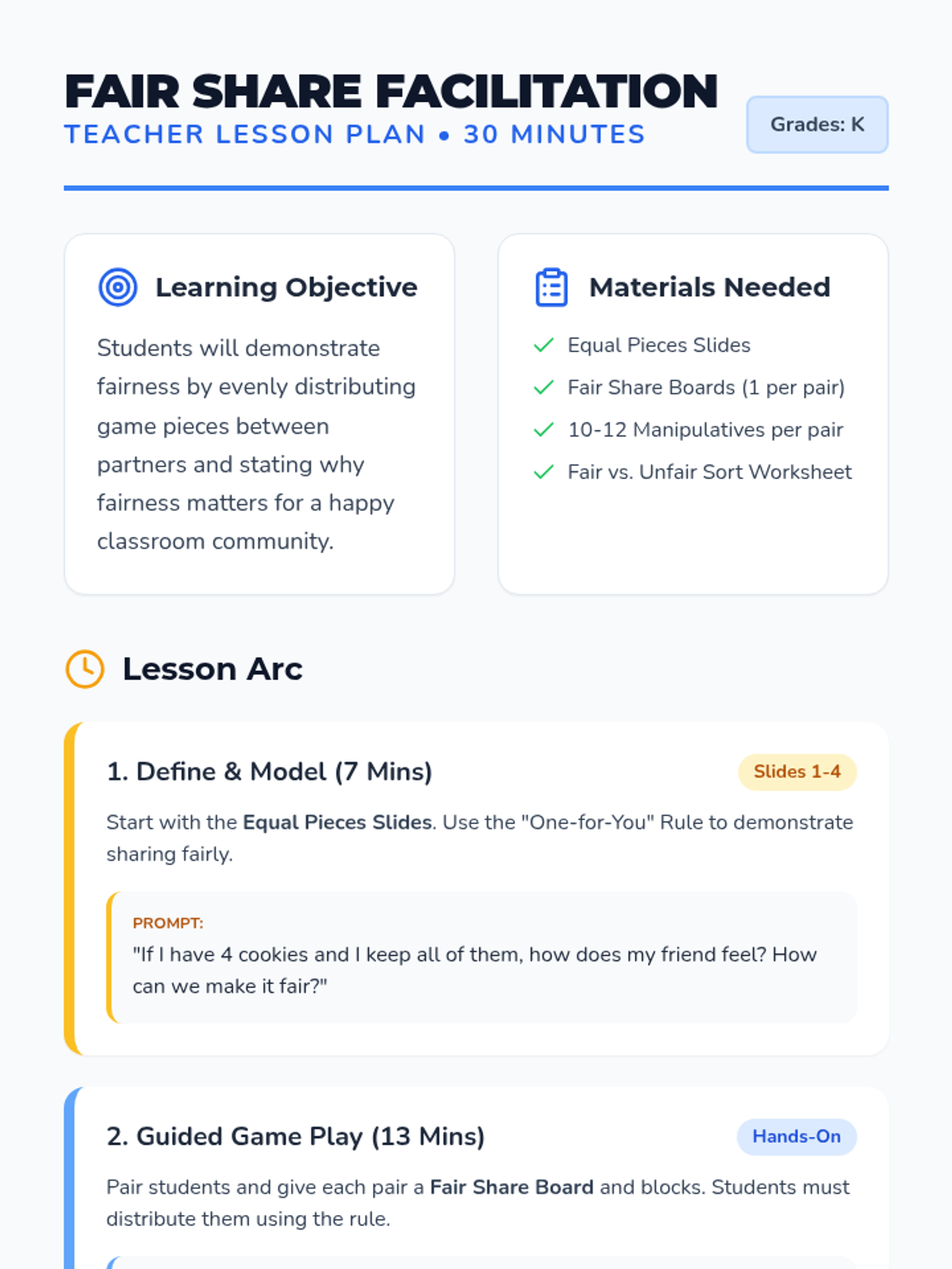 A comprehensive facilitation guide for teachers to lead the Fair Share Game lesson. It includes instructional pacing, materials lists, teacher prompts, and a breakdown of the 30-minute instructional arc.
