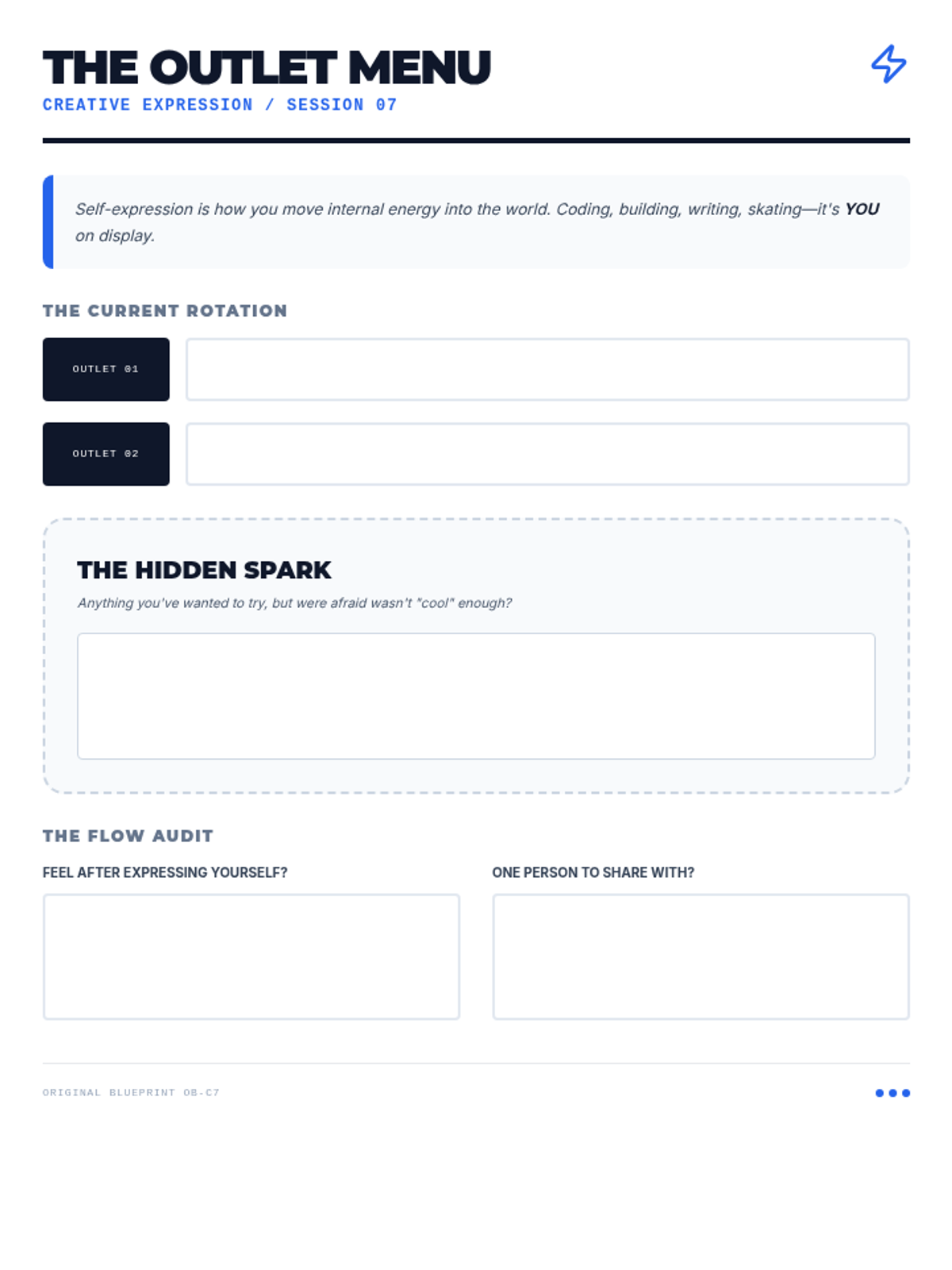 Reflective worksheet for Session 7. Consolidated to a single page, increased reflection heights, and improved border contrast.