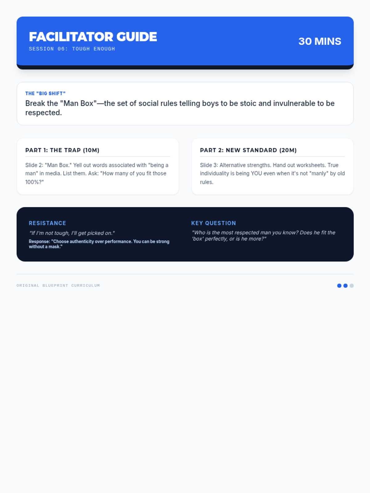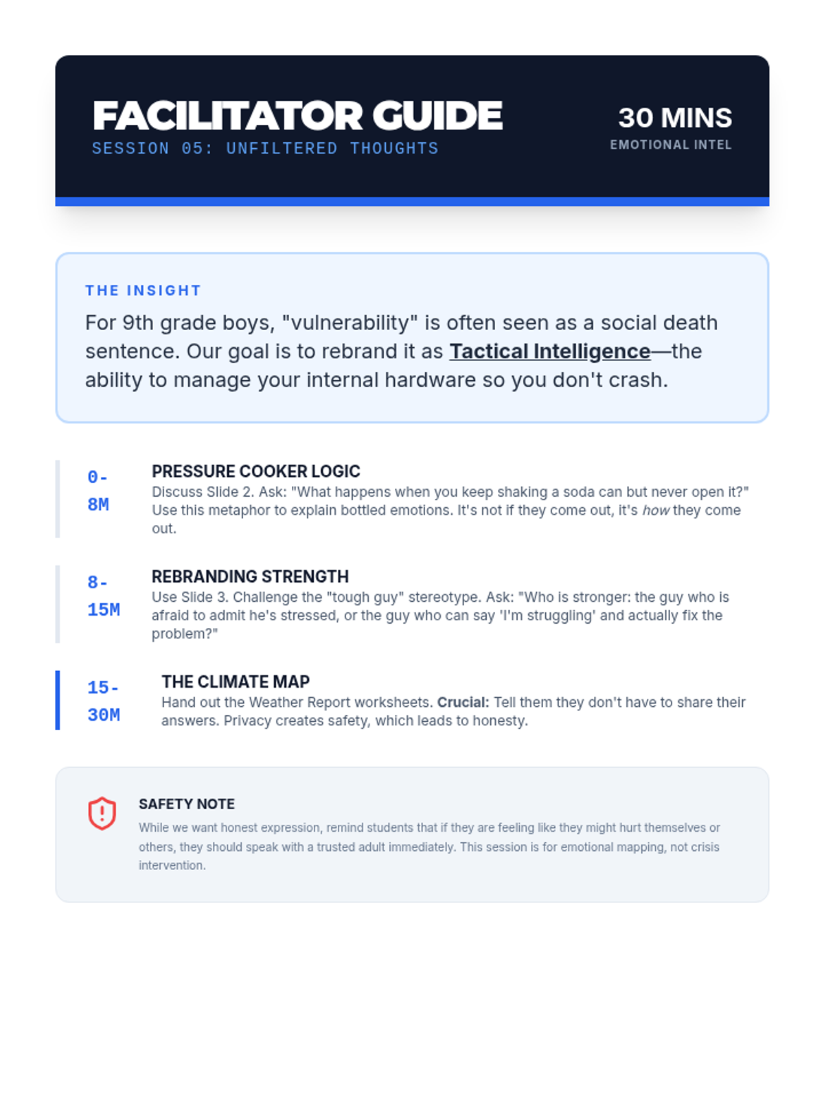 Facilitator guide for Session 5, providing guidance on how to navigate sensitive emotional discussions and reframe vulnerability as a form of intelligence.