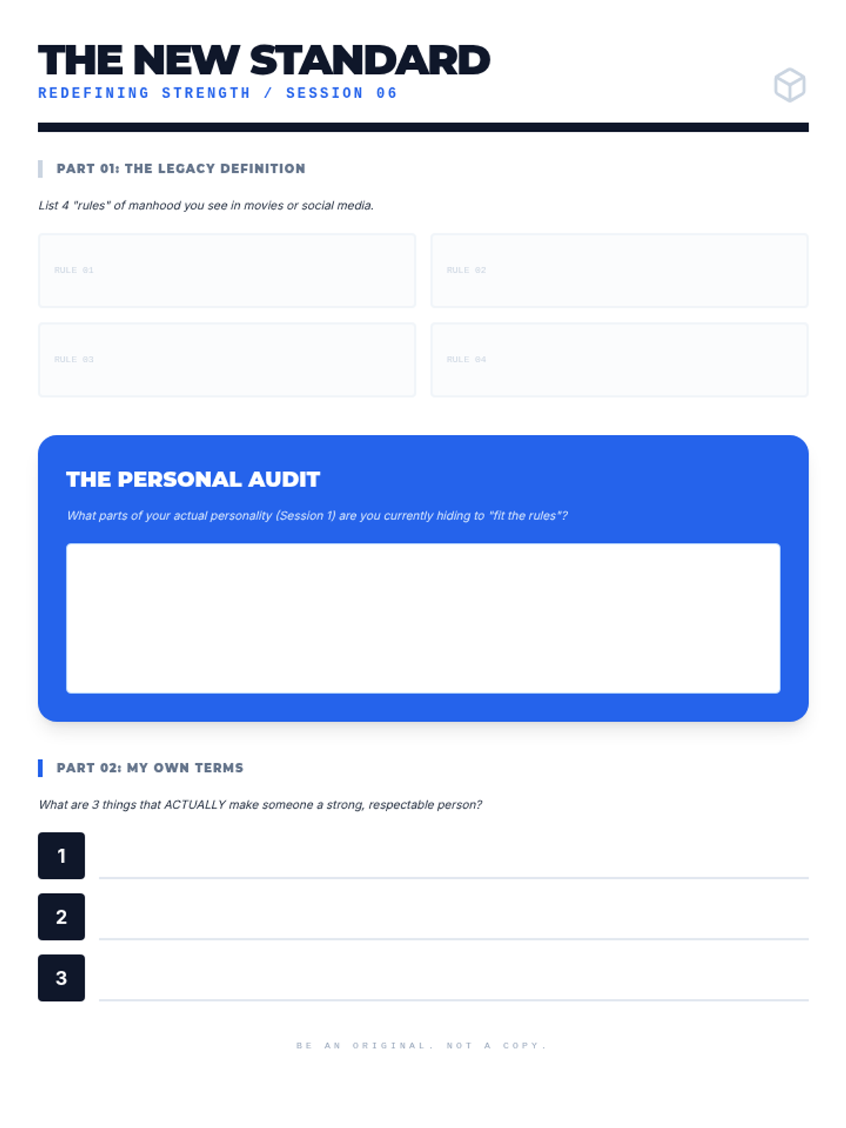 Reflective worksheet for Session 6. Fixed page breaks, increased box height for rules, and switched dark blue work area to white for legibility.