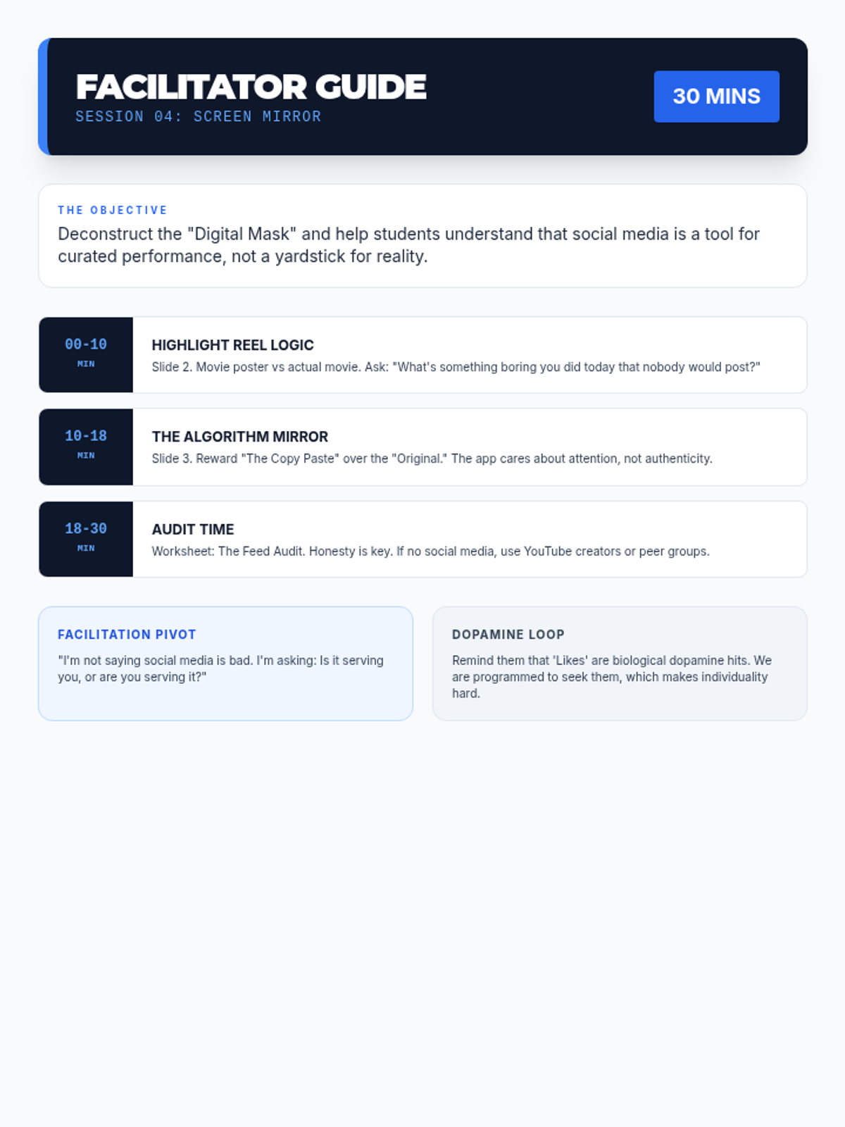 Facilitator guide for Session 4. Optimized for single-page printing. Fixed time stamp formatting and text contrast.