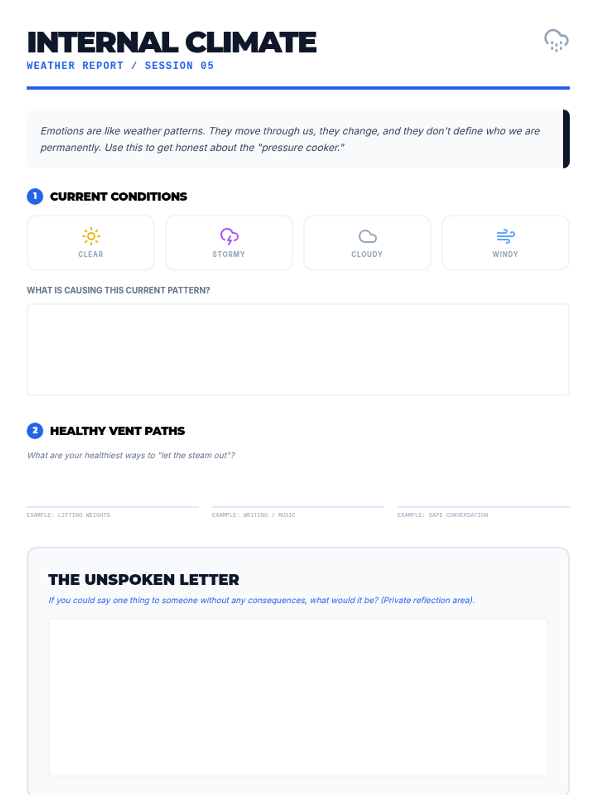 Reflective worksheet for Session 5. Fixed page breaks and switched dark work area to white for handwriting legibility. Fixed bracketed placeholders.