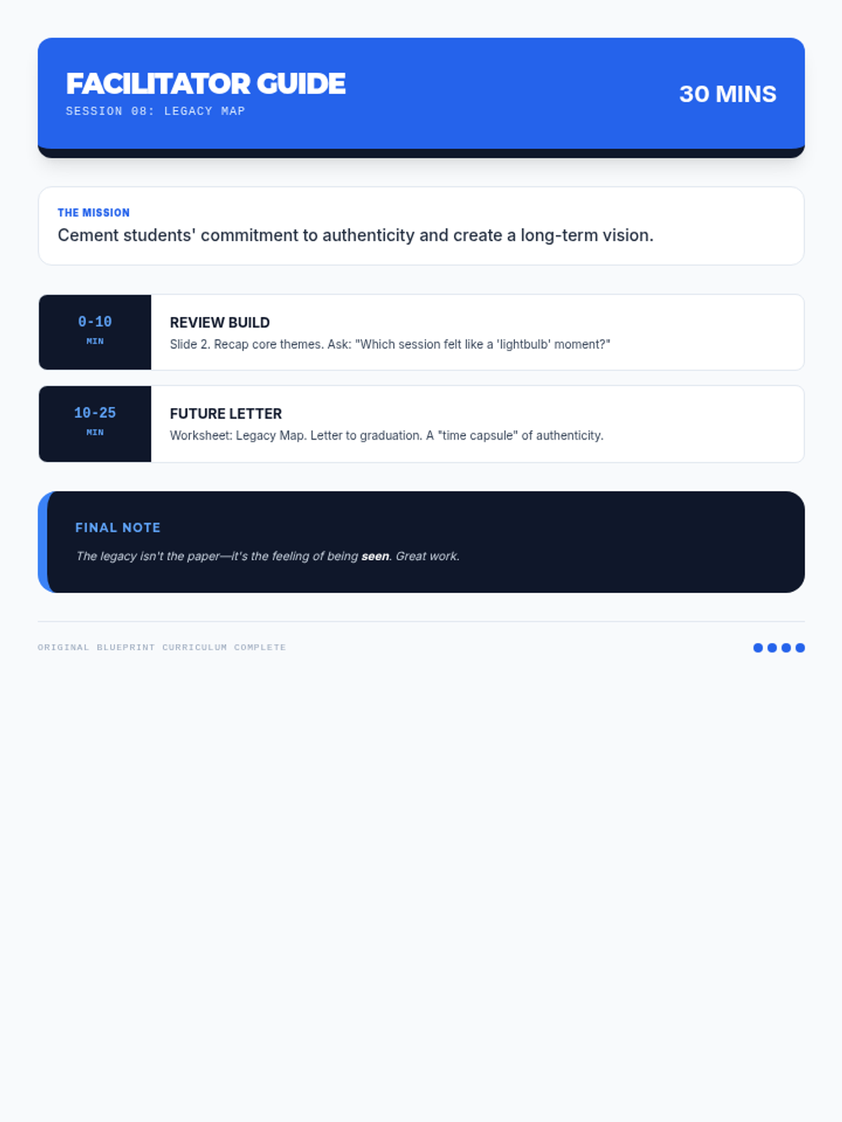 Facilitator guide for Session 8. Optimized for single-page printing. Fixed page orphaning and time stamp formatting.