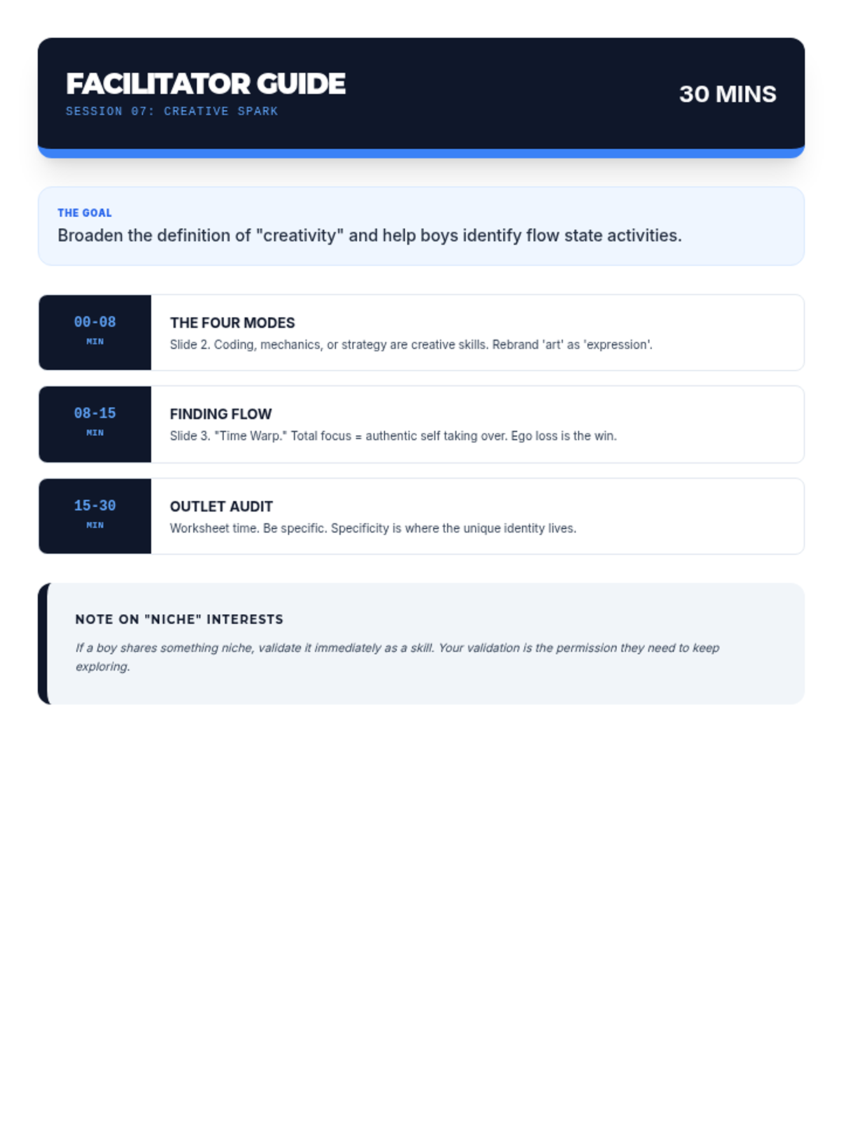 Facilitator guide for Session 7. Optimized for single-page printing. Fixed time stamp formatting and text contrast.
