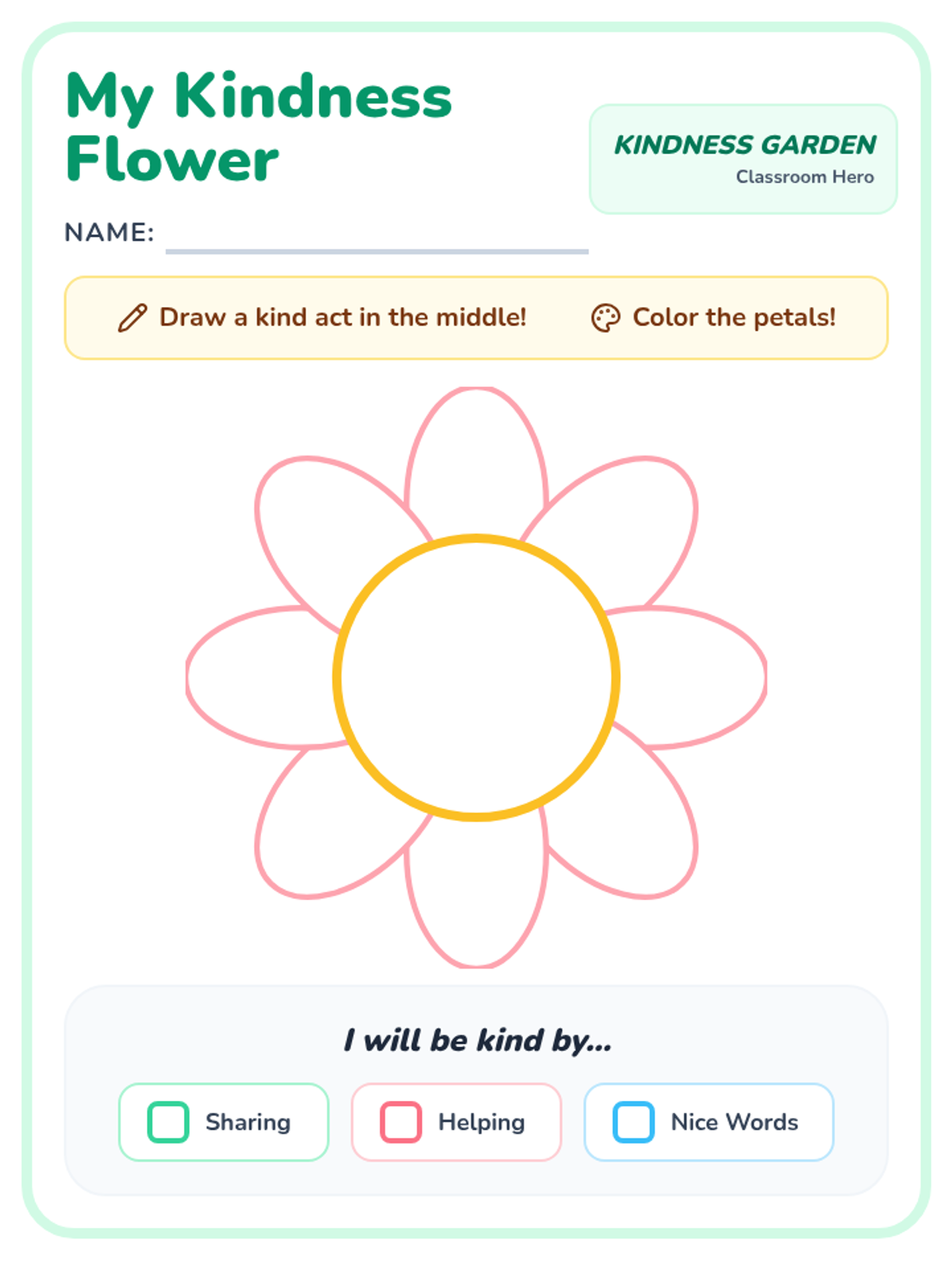 A creative coloring and drawing worksheet for kindergarteners to visualize an act of kindness inside a decorative flower.