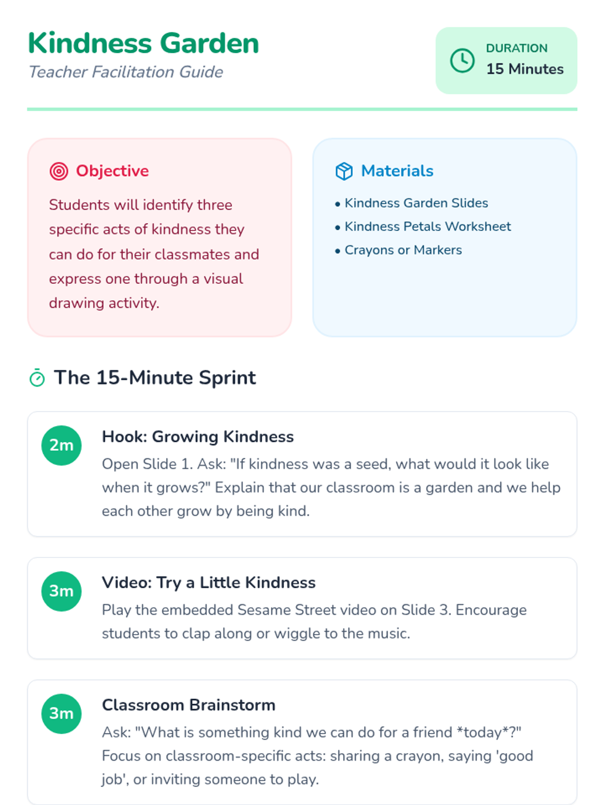 A concise teacher guide for a 15-minute kindergarten lesson on kindness, including pacing, objectives, and specific scripts to use with students.