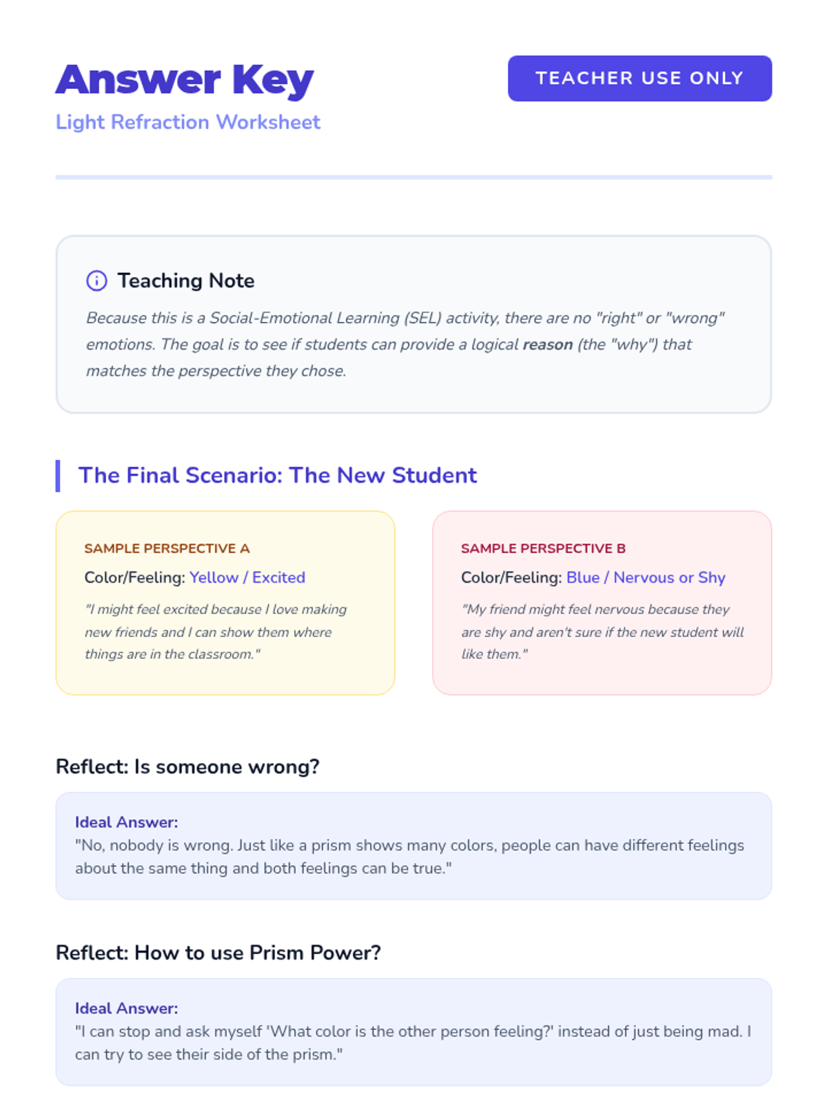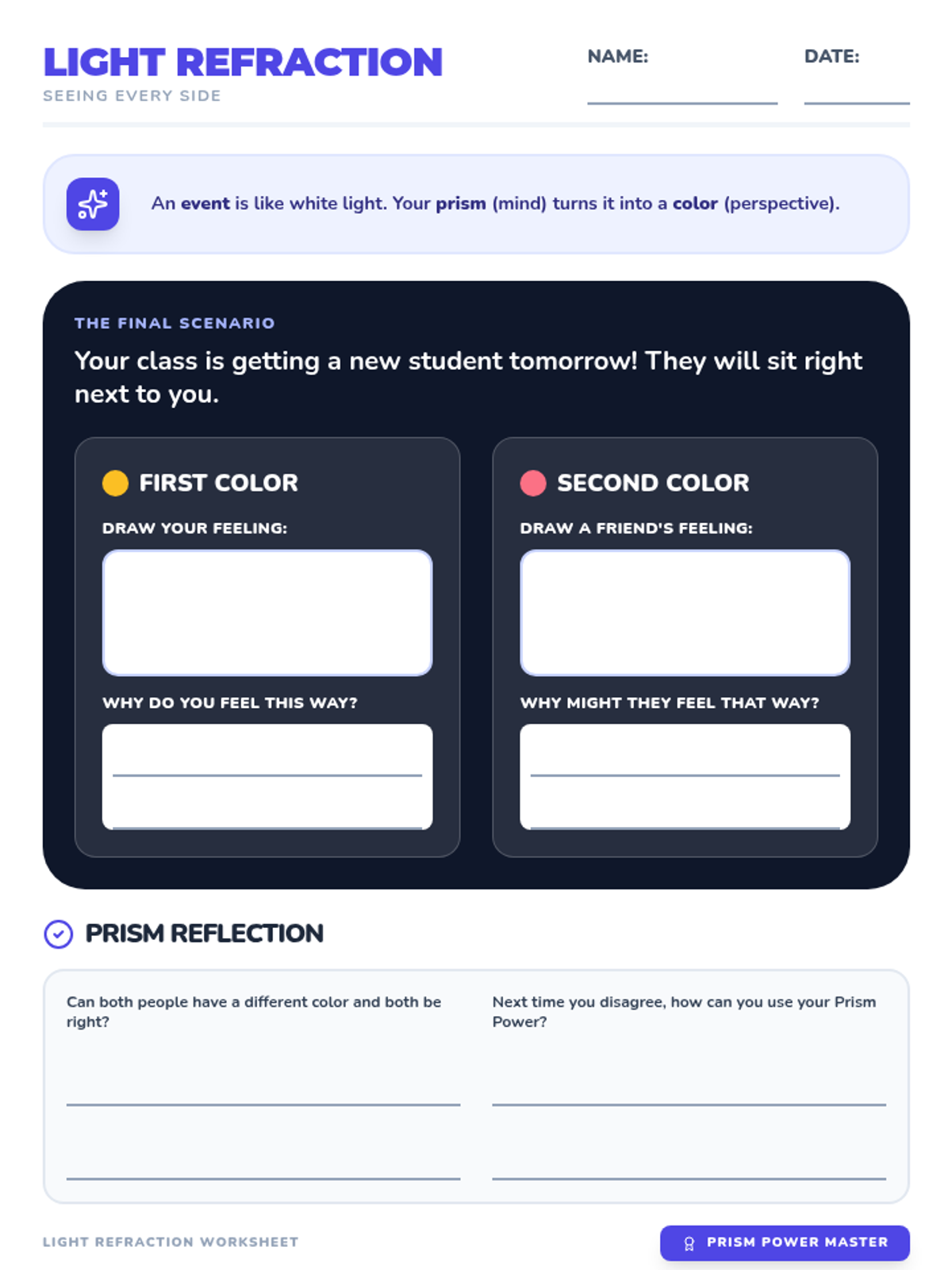 A student-facing worksheet where children analyze a 'new student' scenario by identifying two different emotional perspectives (colors) and reflecting on how to apply the prism metaphor to disagreements.
