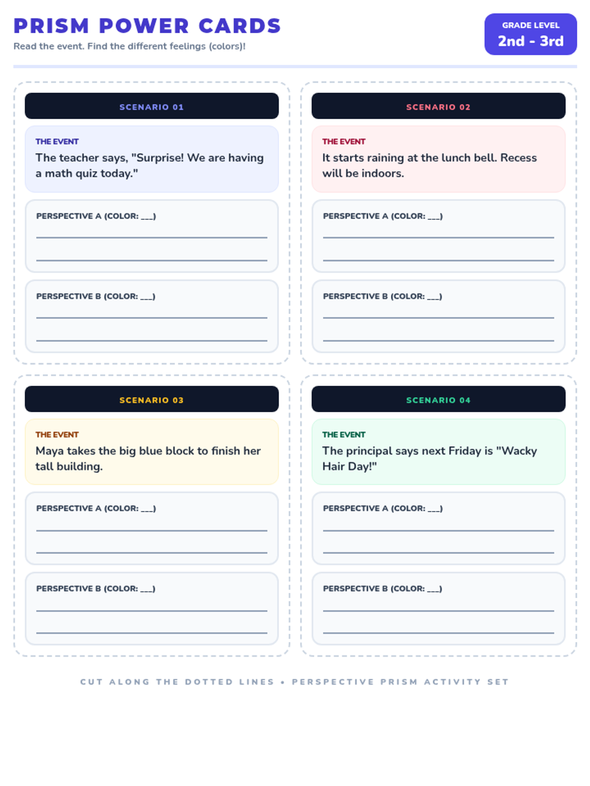 A set of four printable scenario cards featuring realistic school-based events to help students practice identifying multiple perspectives through the prism metaphor.