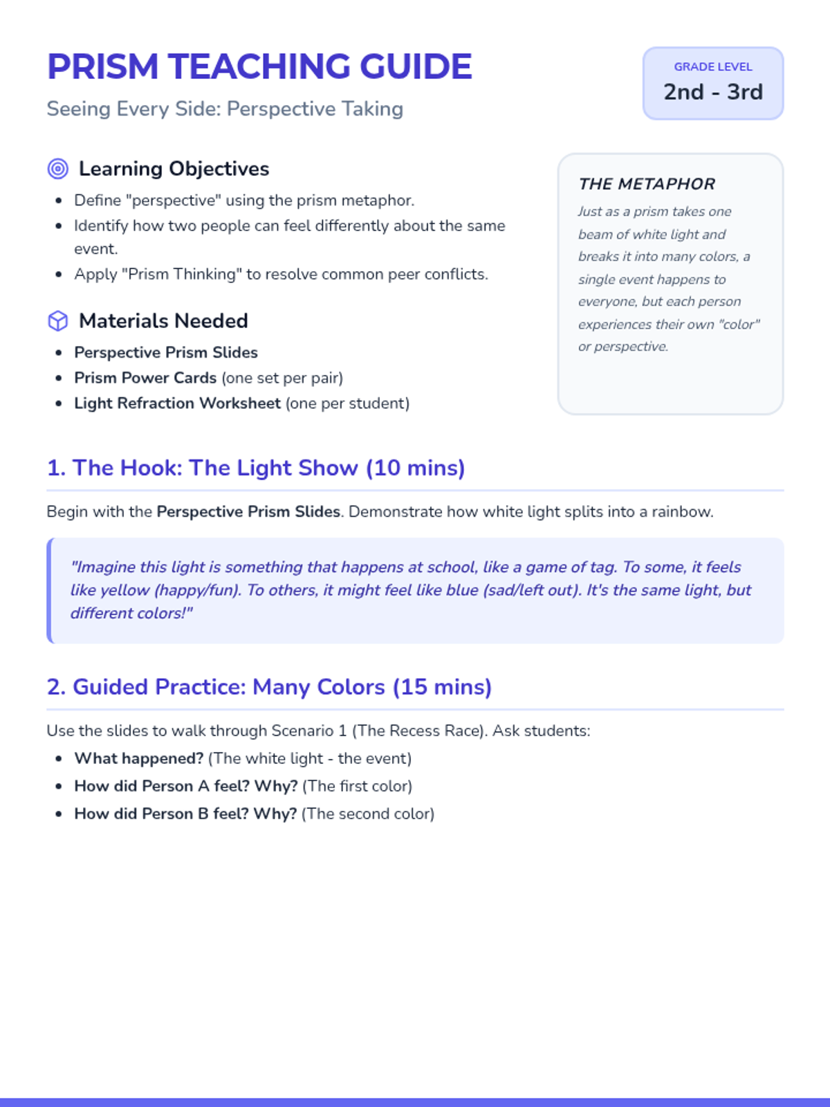 A comprehensive 2-page teacher's guide for the Perspective Prism lesson, detailing objectives, materials, and a step-by-step instructional flow using the prism metaphor for conflict resolution.