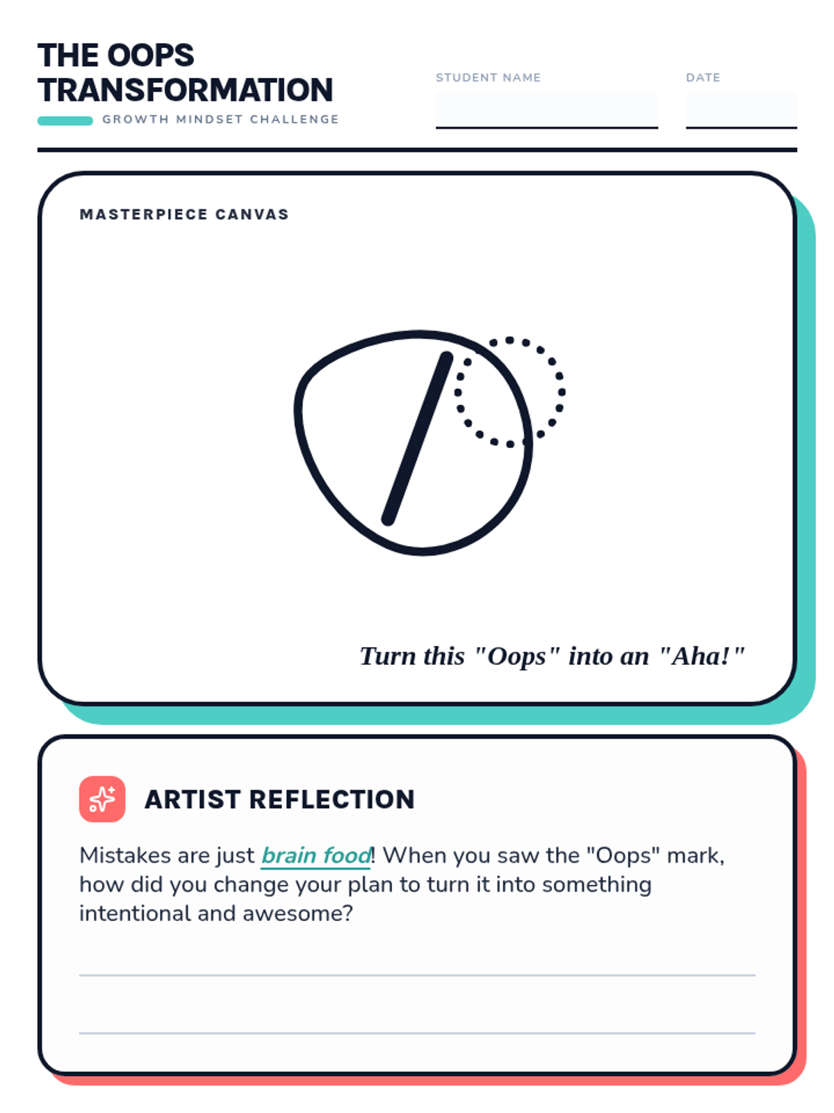 Maximized drawing space version of the 4th-grade worksheet with a kid-friendly reflection question. The 'Masterpiece Canvas' is the central focus, while the reflection uses engaging language like 'brain food' and 'Aha! moment' to encourage students to describe their creative problem-solving.