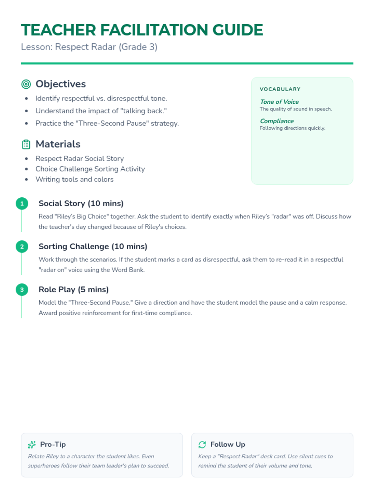 A facilitation guide for teachers to implement the Respect Radar lesson. Includes learning objectives, key terminology, step-by-step implementation instructions, and tips for role-play and follow-up.