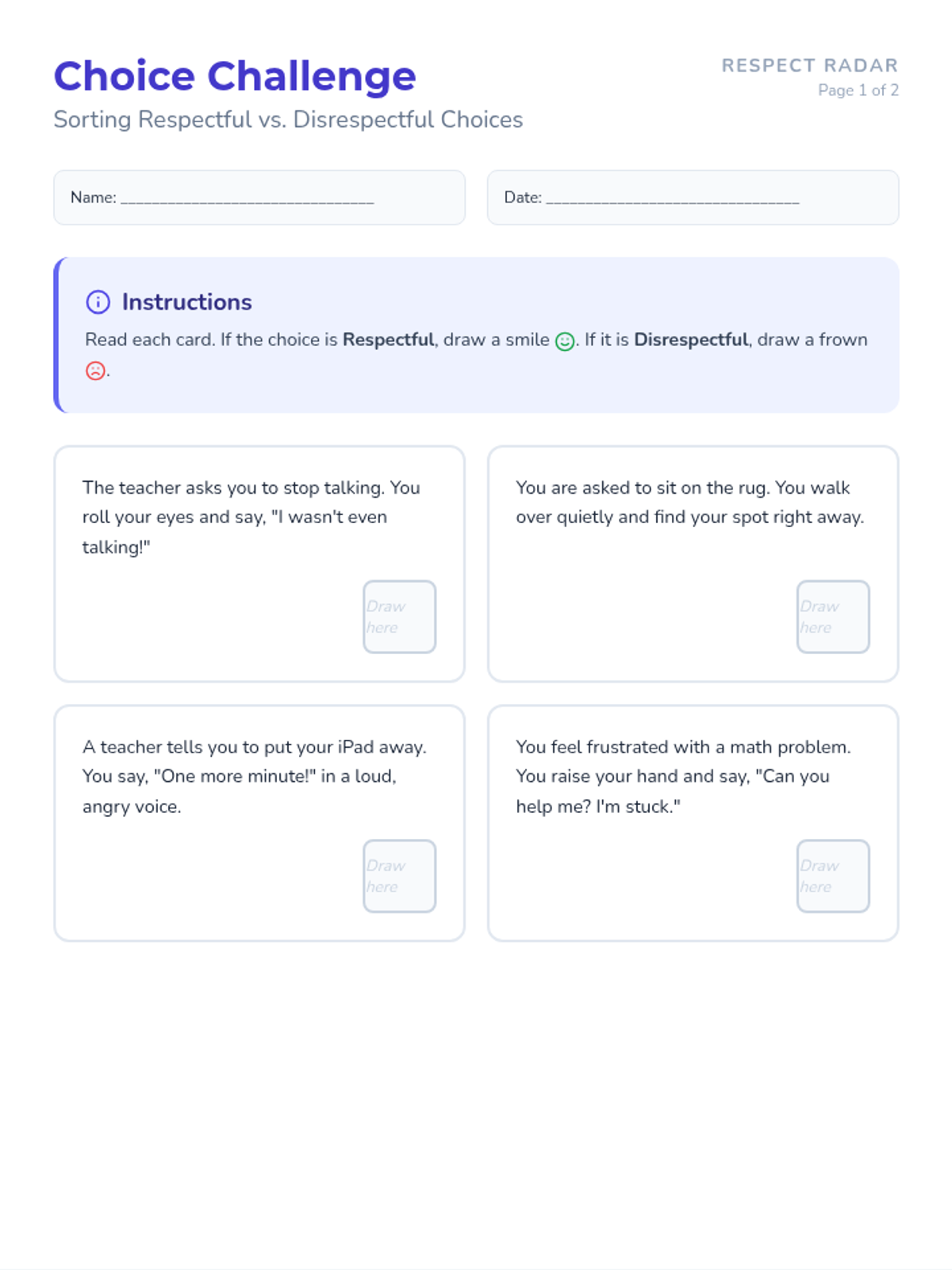 A sorting worksheet where students identify respectful versus disrespectful behaviors in common classroom scenarios. Features identical card styling for objective evaluation and includes a 'Respectful Word Bank' for positive reinforcement.