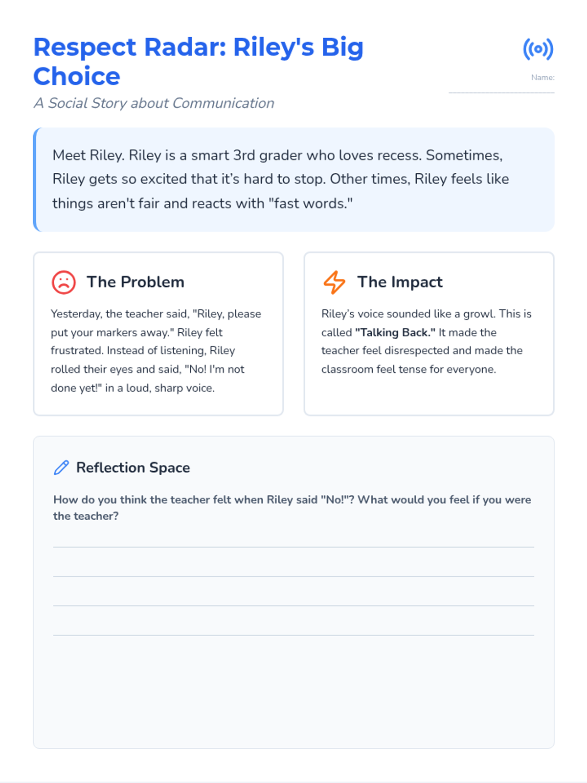 A two-page social story document featuring 'Riley,' a student who learns to manage tone of voice and follow directions using a 'Respect Radar' strategy. Includes reflection prompts and a step-by-step guide for respectful communication.