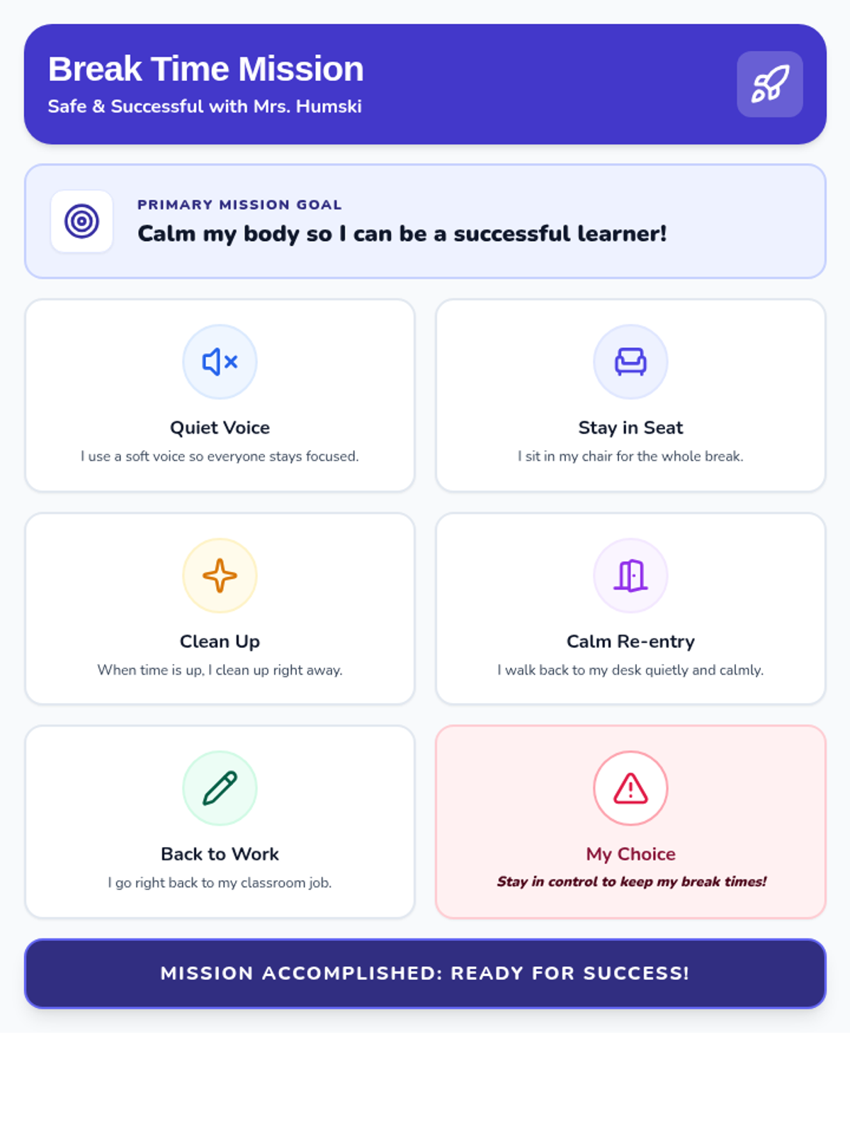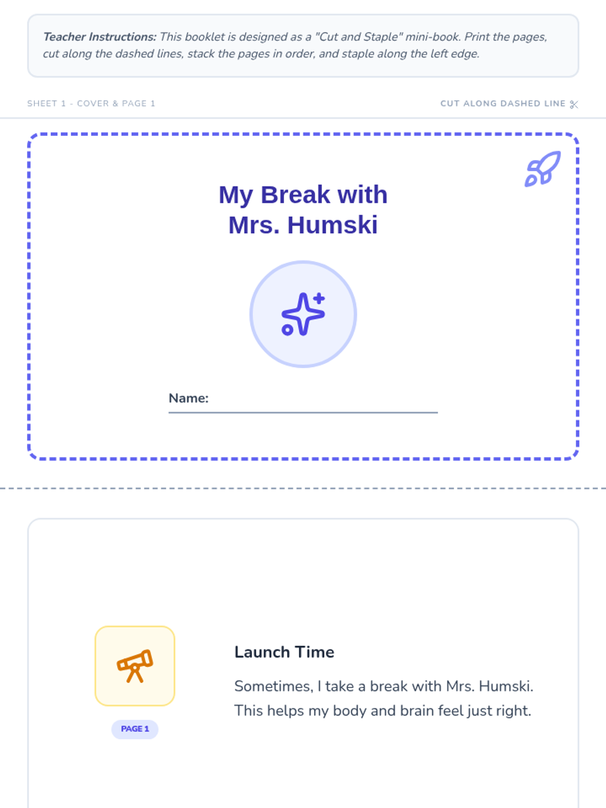 An 8-page space-themed mini-booklet social story that explains the expectations and purpose of taking a break with Mrs. Humski, featuring calm bodies, cleaning up promptly, and classroom success. Designed for easy printing and assembly.
