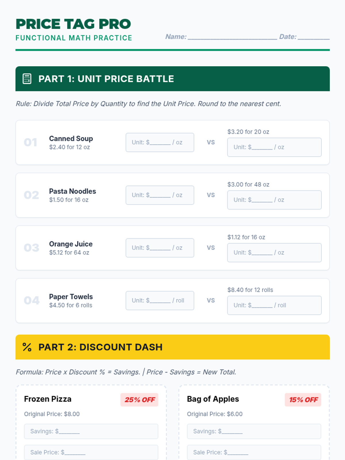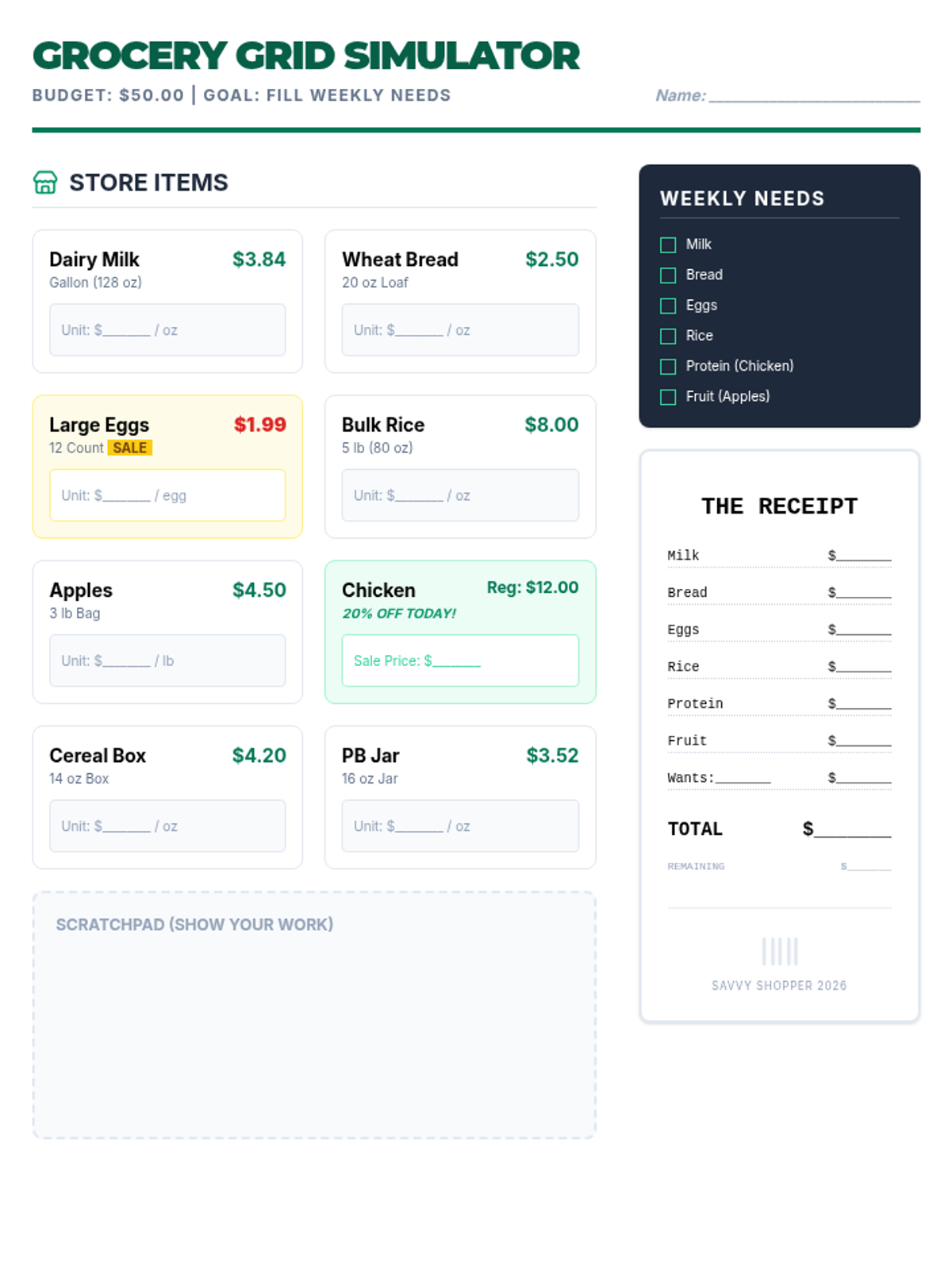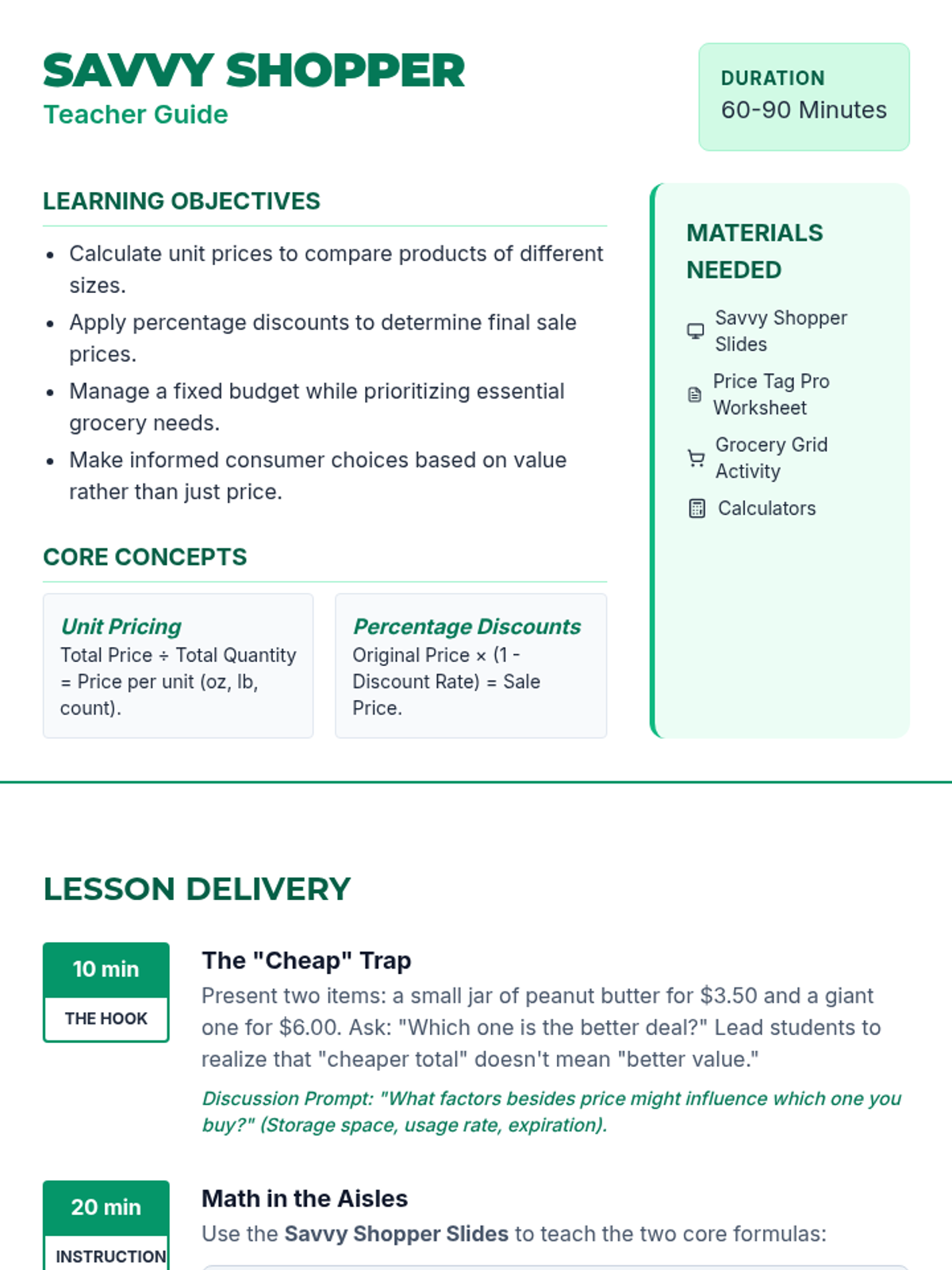 A comprehensive teacher guide for the Savvy Shopper lesson, including objectives, detailed lesson delivery steps, differentiation strategies, and assessment tips for teaching functional grocery math.