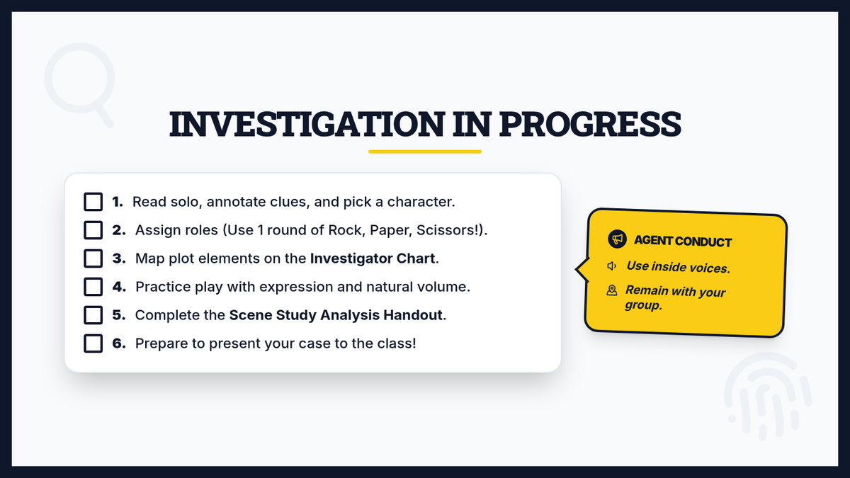 Instructions for the Mystery Performance Lab, guiding students through solo reading, role assignment with tie-breakers, plot analysis, fluency practice, and final presentation.