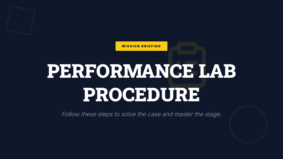 A single display slide featuring a 6-step checklist of the performance lab procedures, including a reminders for classroom conduct and group participation. Fixed layout to prevent overlap.
