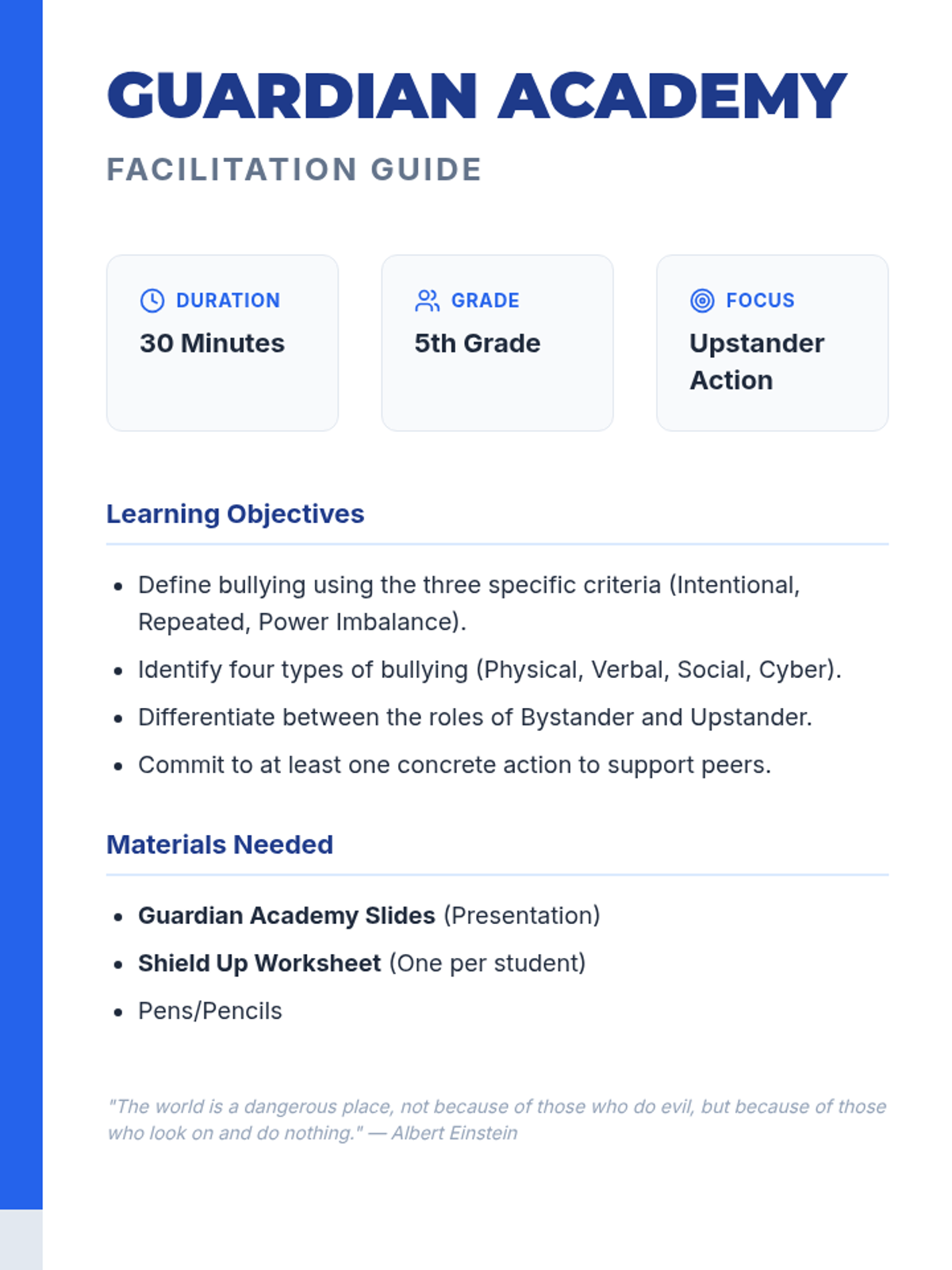 A comprehensive facilitation guide for teachers to deliver the 30-minute 'Guardian Academy' lesson. It includes pacing instructions, discussion prompts, learning objectives, and advice for handling student disclosures.