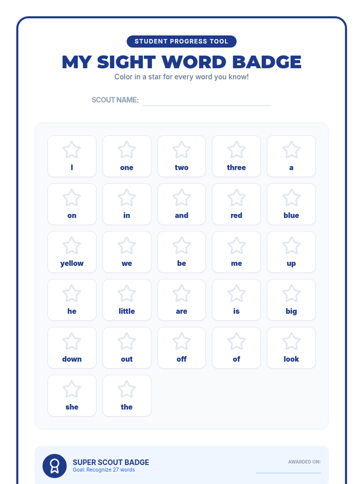 A student-facing mastery chart for tracking sight word progress. High-contrast black and white design. Shuffled word order. Compact for single-page printing. Name field and Title updated as requested. White star background for coloring clarity.