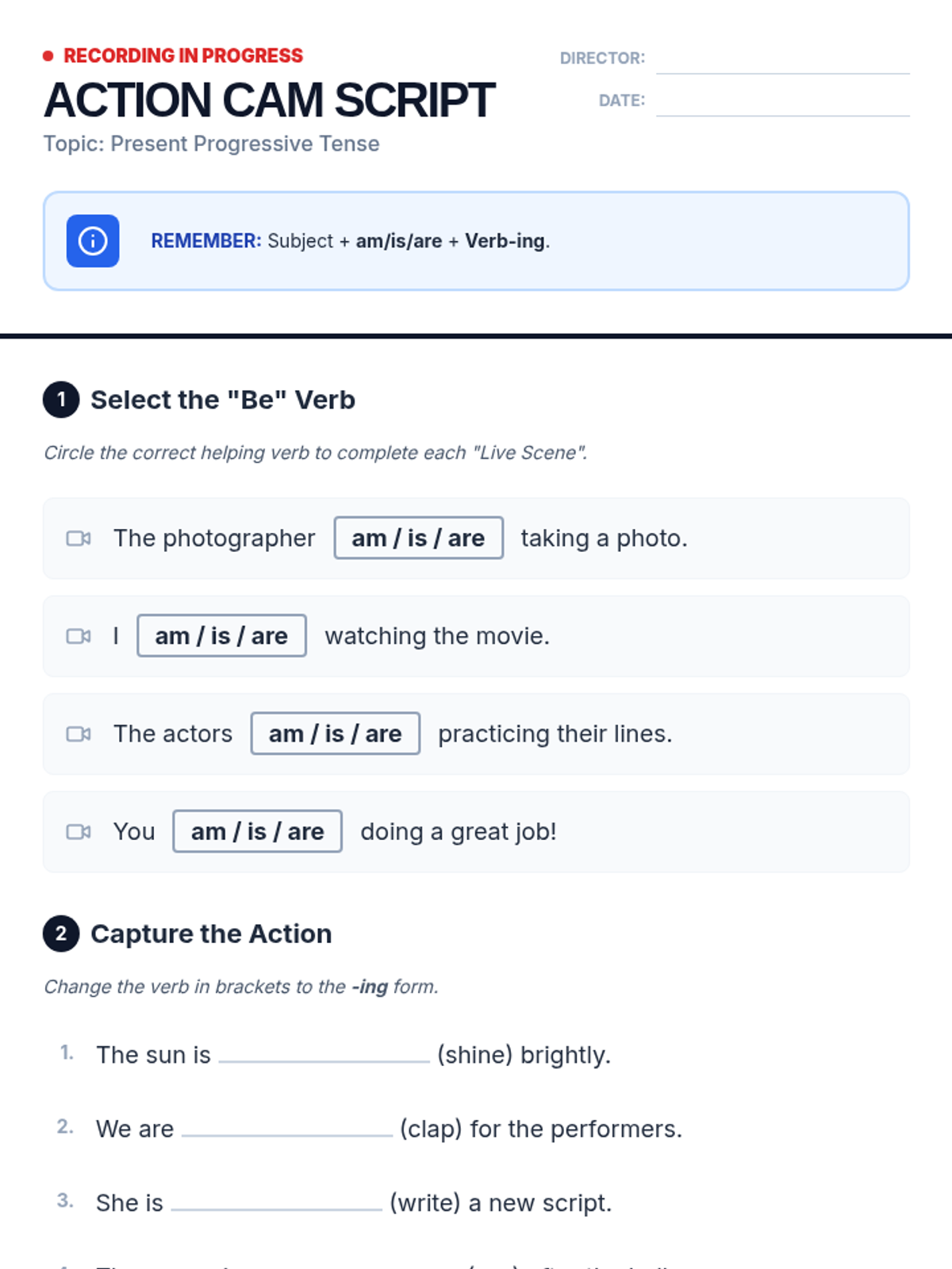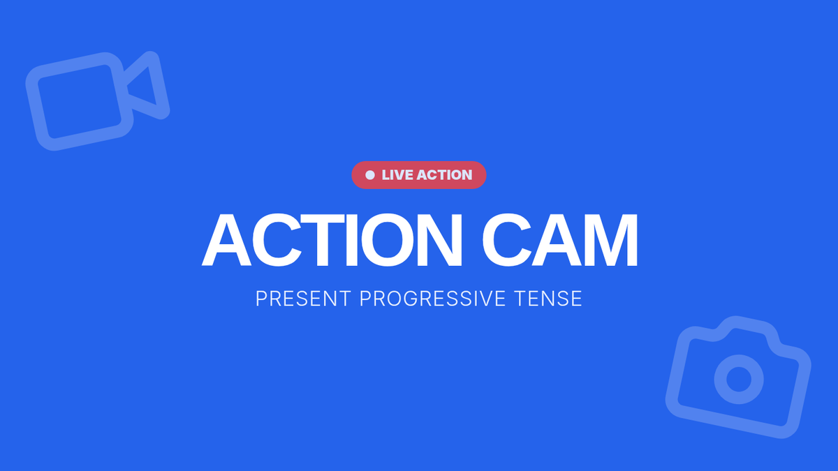 A vibrant, high-energy slide deck that introduces the Present Progressive tense using a filmmaker theme, featuring guided practice and interactive checks.