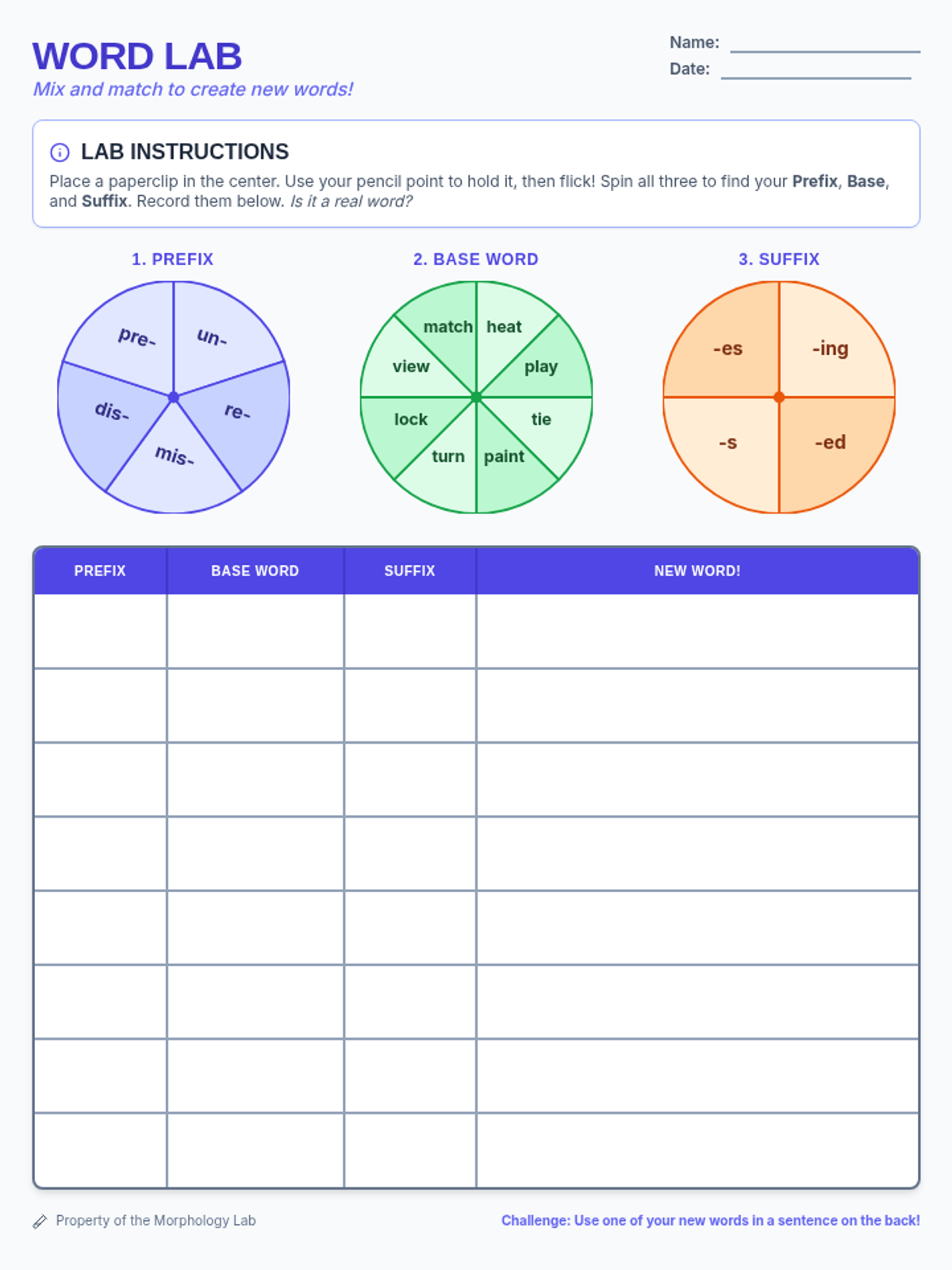 A hands-on morphology worksheet featuring three spinners for prefixes, base words, and suffixes. The recording chart has been enhanced with darker, thicker borders to ensure high quality when photocopied.