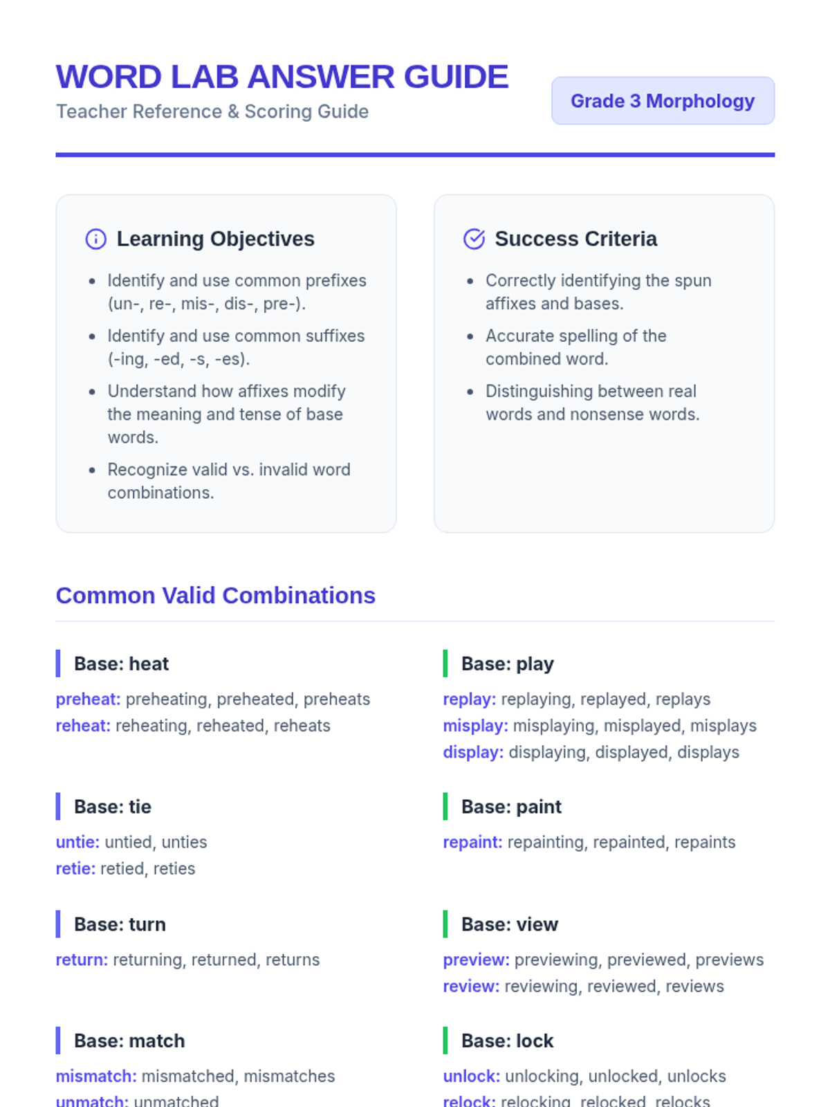 A teacher's answer guide and reference sheet for the Word Lab Spinner Worksheet. It includes common valid word combinations, learning objectives, and discussion prompts for students.