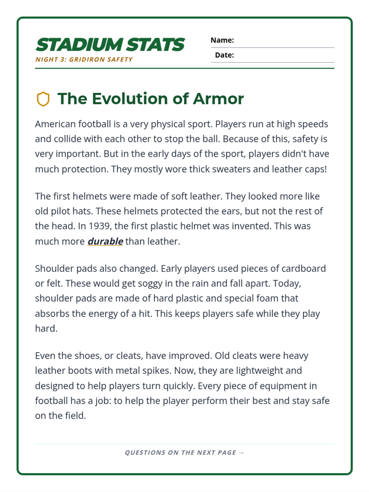 Day 3 of the homework packet focusing on football equipment evolution. Features a 4-paragraph passage and 7 comprehension questions. Revised for better page layout and larger work areas.