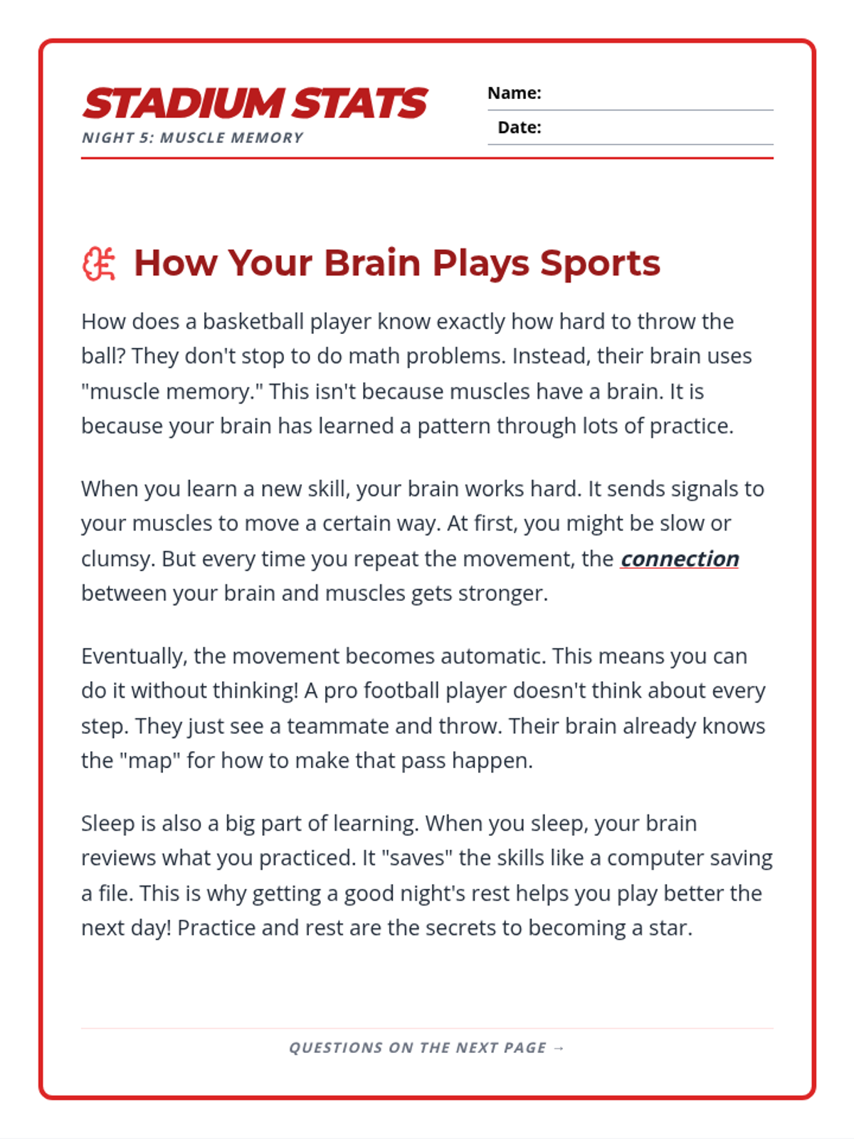 Day 5 of the homework packet about muscle memory and the brain. Features a 4-paragraph passage and 7 comprehension questions. Revised for better page layout and larger work areas.