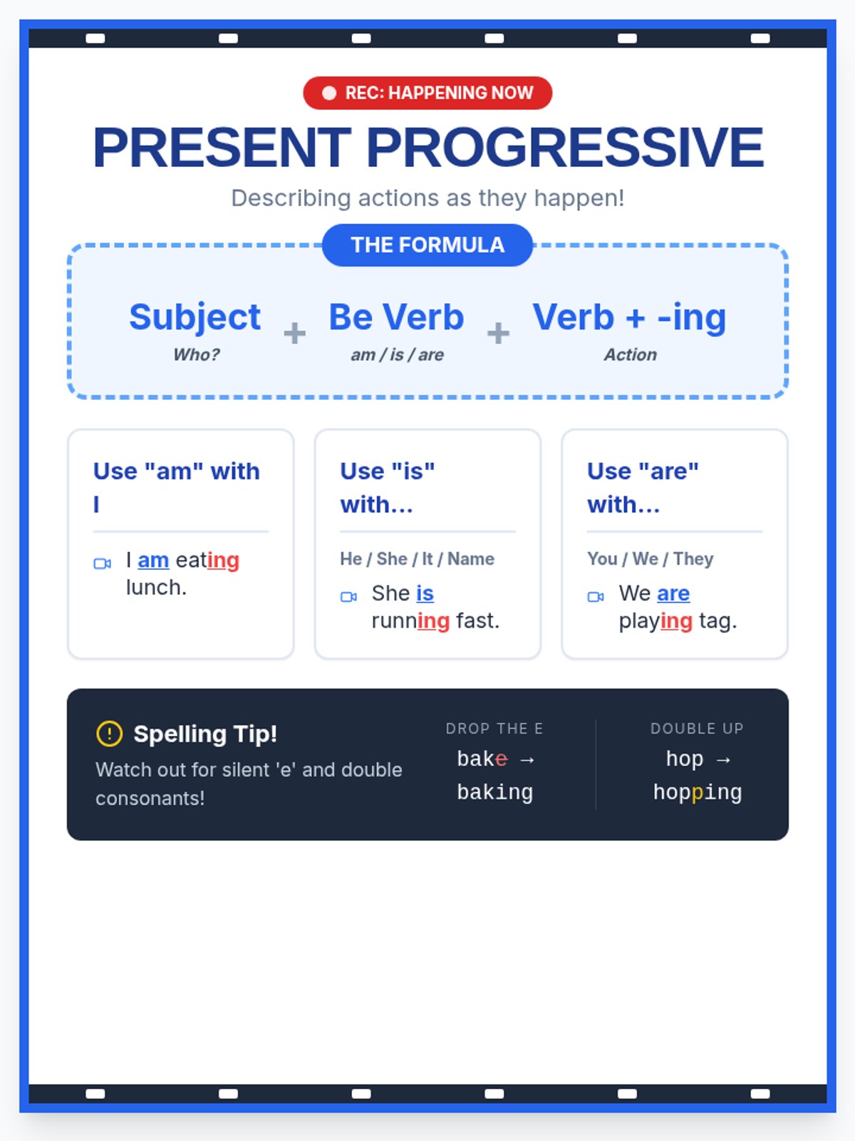 A high-contrast anchor chart that breaks down the Present Progressive formula (am/is/are + verb-ing) with clear examples and spelling tips.