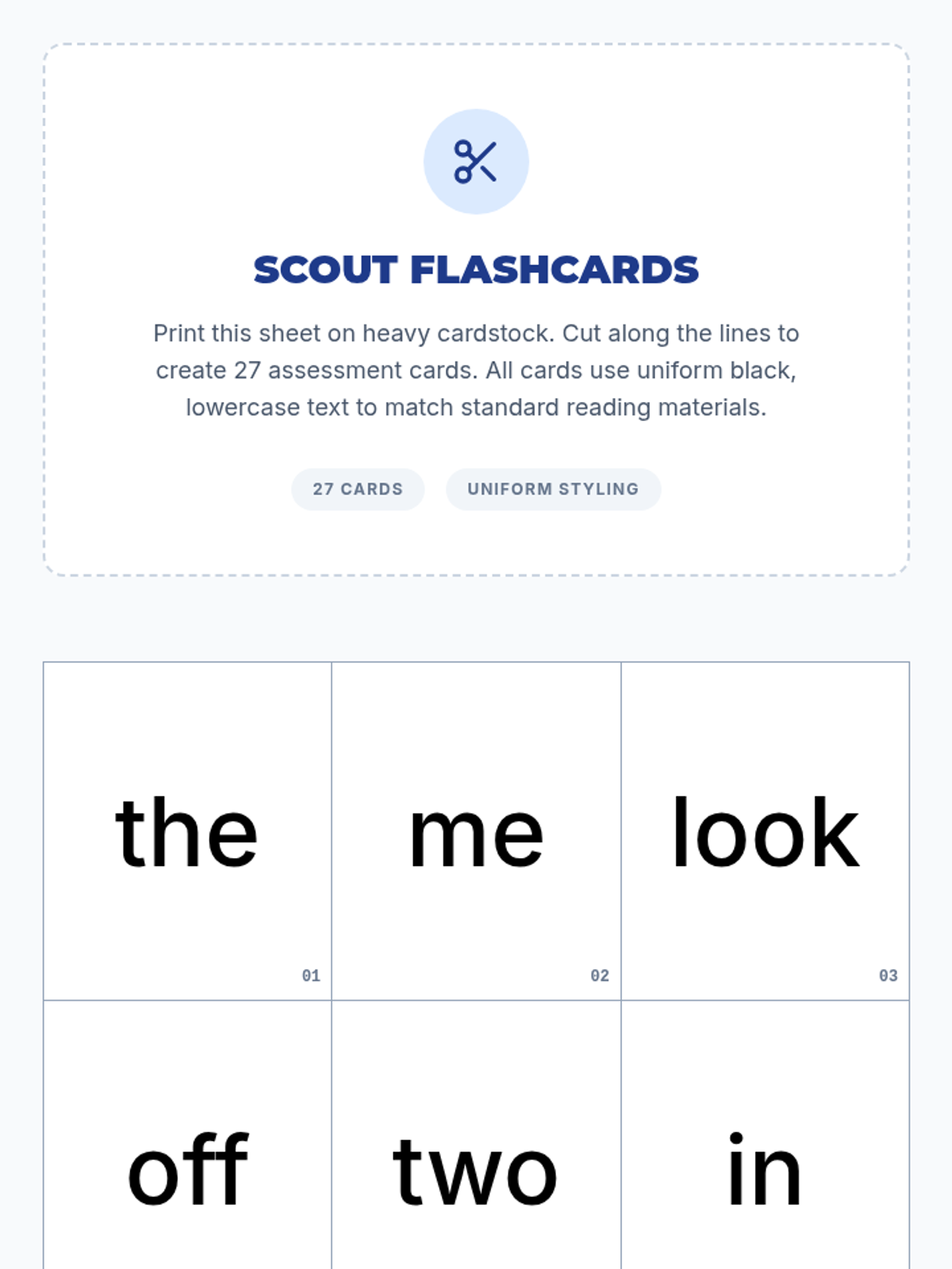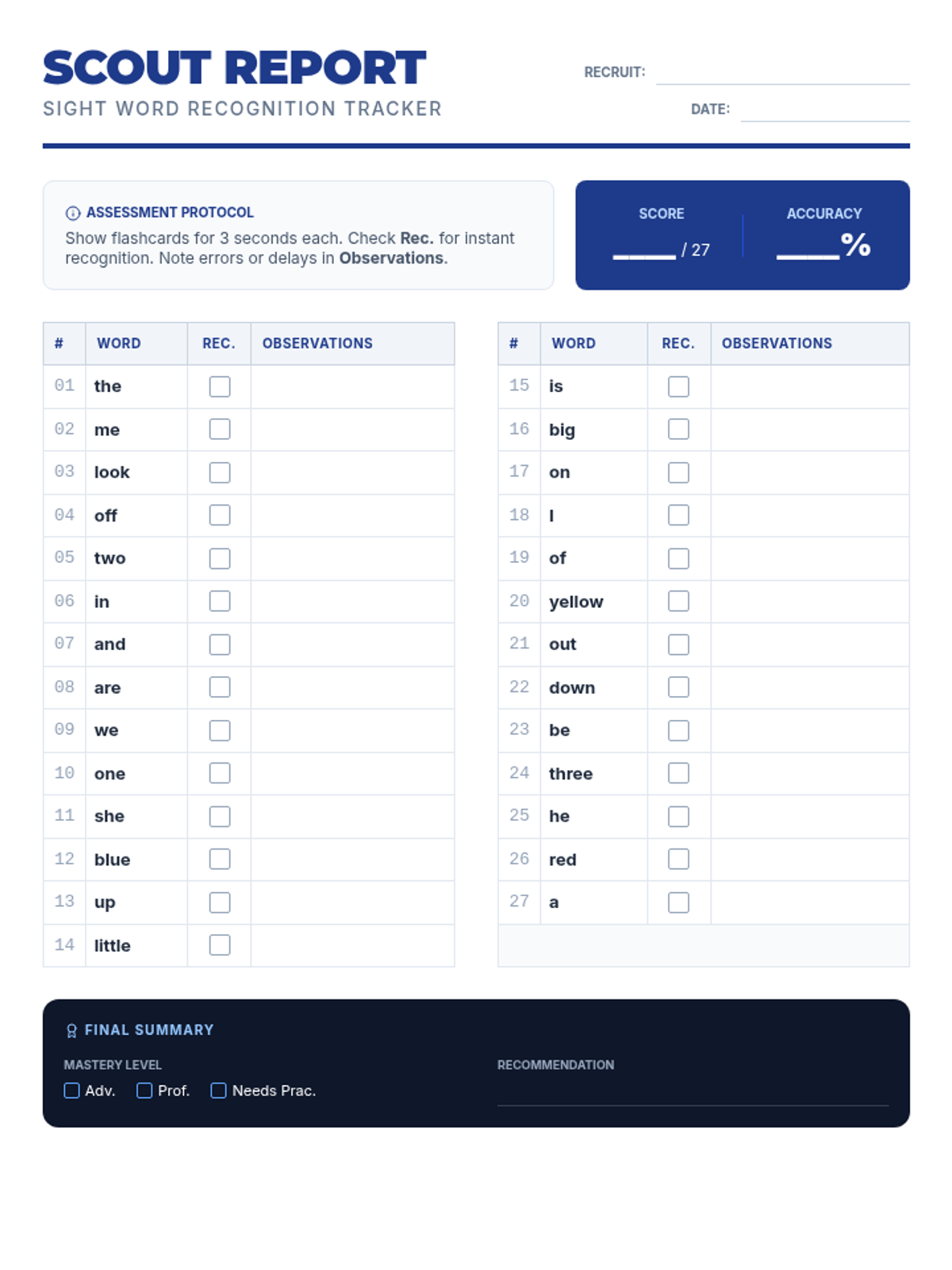 A set of 27 high-contrast printable flashcards designed for student sight word recognition assessments. High-contrast black and white design. Cards are numbered and shuffled. Includes cutting guides and teacher checklist. Name and Title updated as requested. Deeper shuffle and improved checklist spacing. Standardized card sizes across all pages.